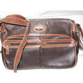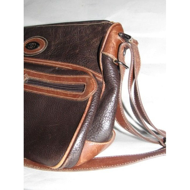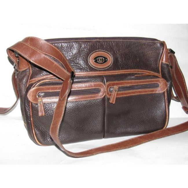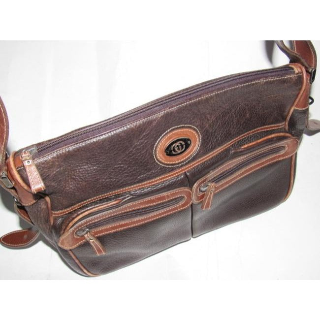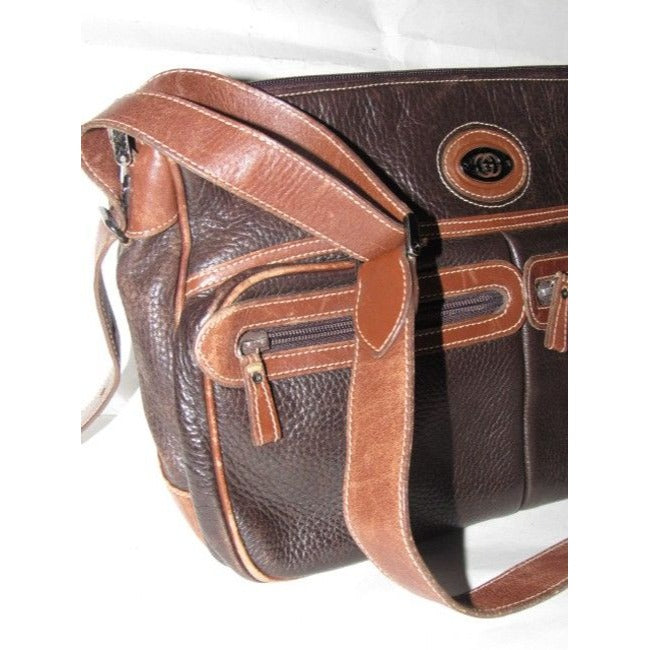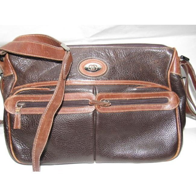* For sale is a Gucci, two-tone, dark brown textured and caramel colored smooth leather, roomy, zip top, tote or satchel style, cross body or shoulder bag with equestrian accents and two exterior front pockets! This is a classic, gorgeous bag that is perfect for everyday!