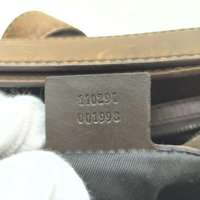 On the interior there is one main compartment with a back zipper pocket. It is lined in brown fabric. The bag has minimal wear to the lining and it is very clean! It looks very lightly used. The purse has a leather tag beneath the interior zip pocket with 'GUCCI, made in Italy embossed on the front and the serial number 110279 001998 on the back. This is beautiful bag in a rare, coveted style with the edgy nail head accents and gold hardware! Don't miss out!