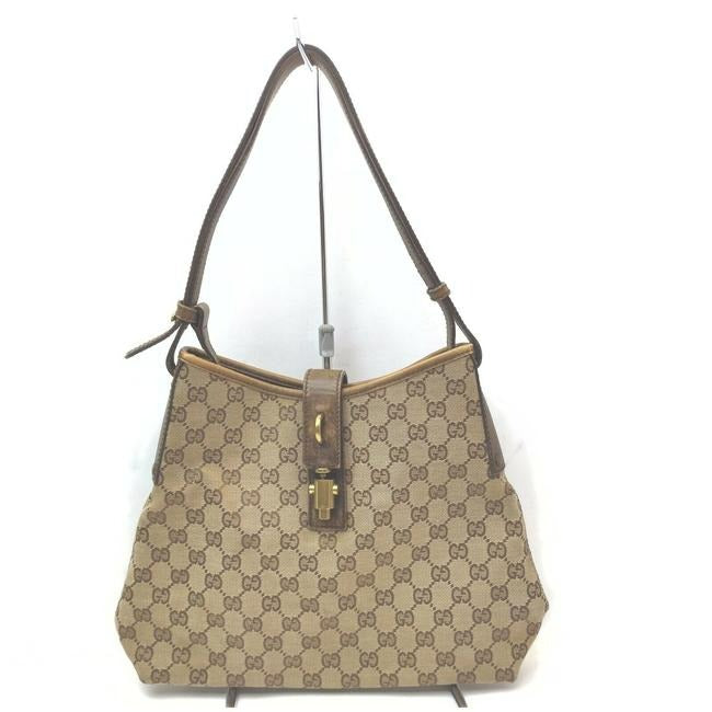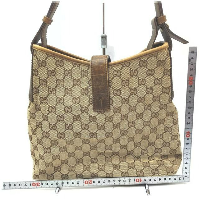 The purse is made of brown Guccissima print canvas and brown leather! It has gold hardware comprising the a piston style clasp, nail head accents, and d-ring accent. It has the shape of the Jackie hobo with a single strap that doubles up and an open top! It has the true 1960's Gucci mod look! This would be a great everyday brown purse!