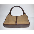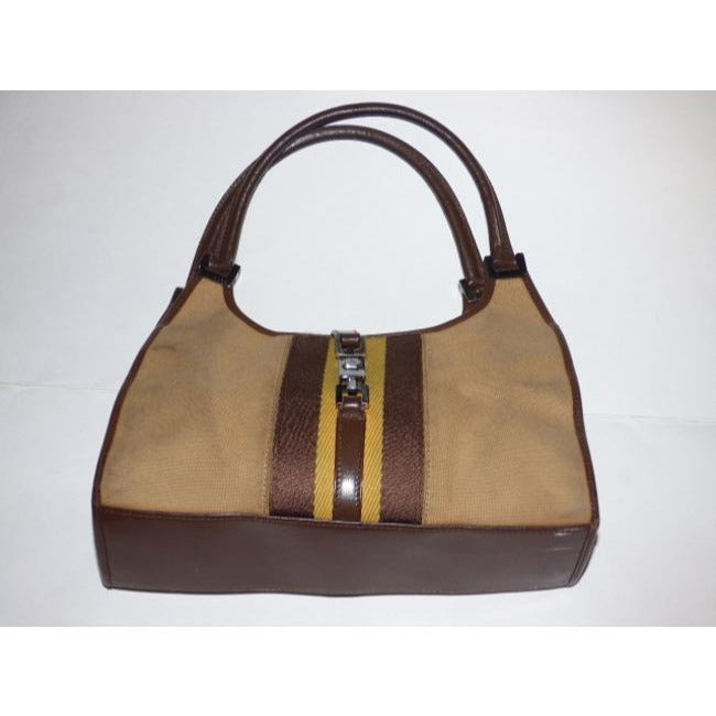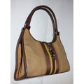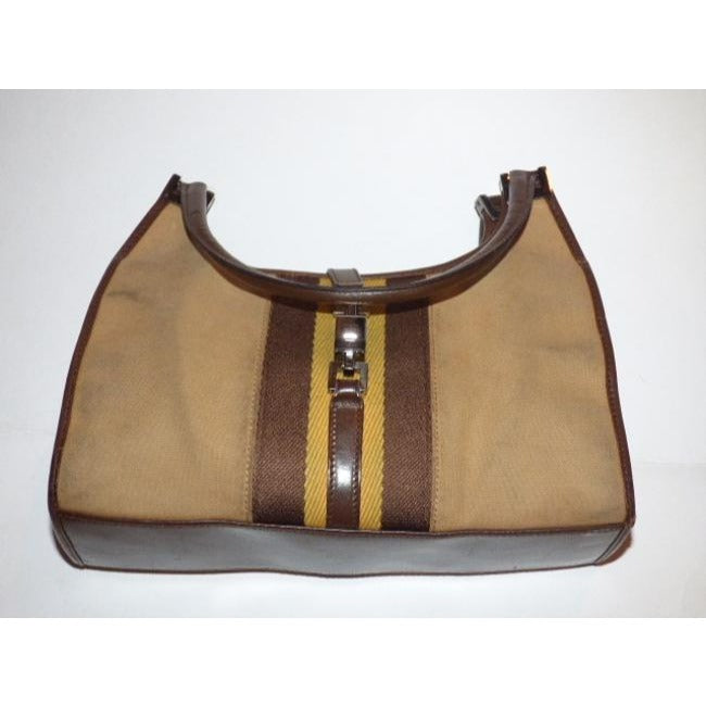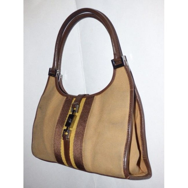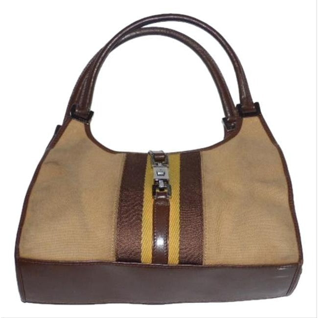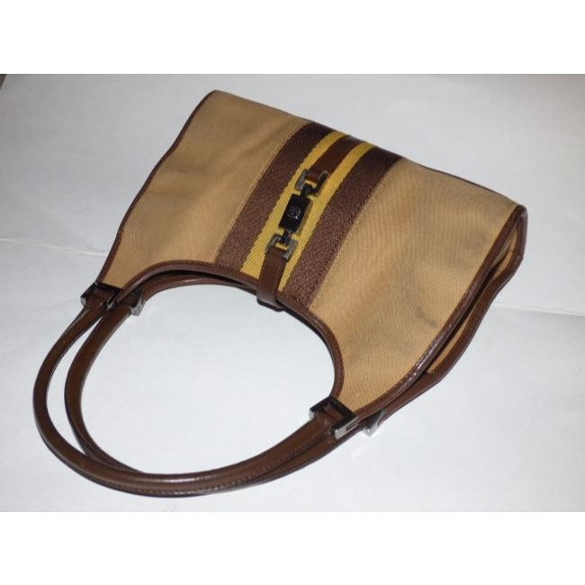 Gucci Tan Canvas and Brown Leather Jackie Bardot Style Hobo Shoulder Bag W Yellow & Brown Sherry Stripe & Chrome Hardware