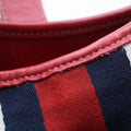 The bag is the perfect Jackie O original by Gucci that everyone wants in this color combination! The exterior is red leather. The purse is the larger size and has triangular not rounded corners, giving it an even more, geometric, triangular look. It has a wide stripe in red, white, and blue with a bold, gold closure and accents!