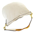 The bag is an XL two-way- hobo style shoulder purse or XL clutch. The body is made of a super soft, white leather and gold hardware. The wide strap is removable but is not adjustable and is made of yellow and red striped canvas. The rounded, pleated bottom purse can hold a lot more than you might think- You also have the option of using another strap if you would like!