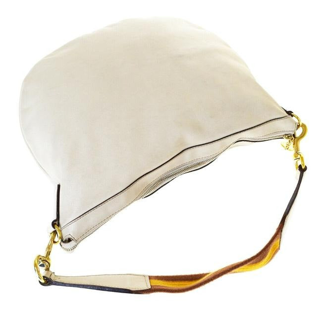 For sale is a Gucci, high-end bohemian, white leather, expandable, hobo style, shoulder bag with a removable, white leather and yellow and red striped canvas shoulder strap, bold gold hardware, a zip top closure, and lots of room! It is a classic style that would be great used as your signature white purse!