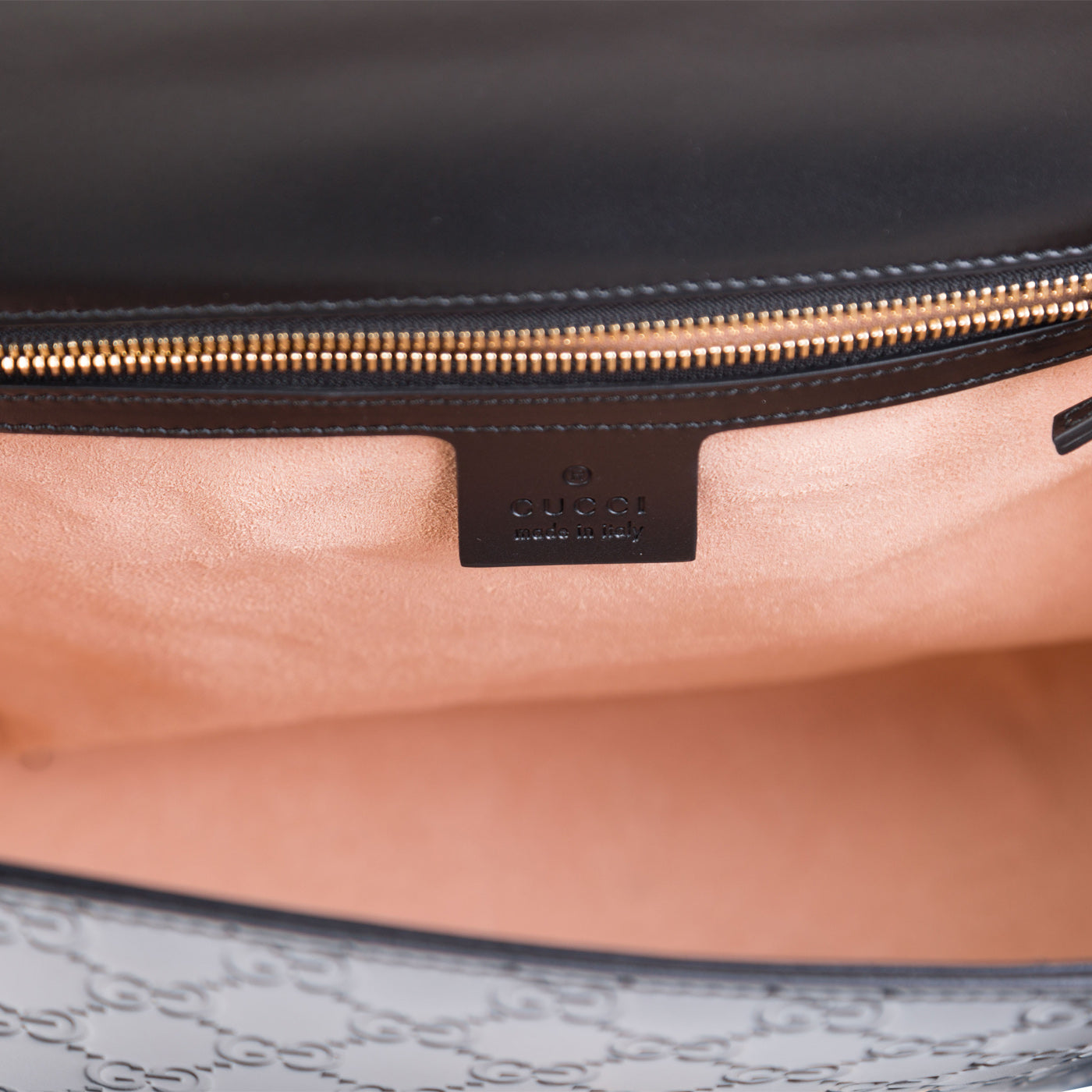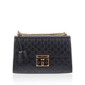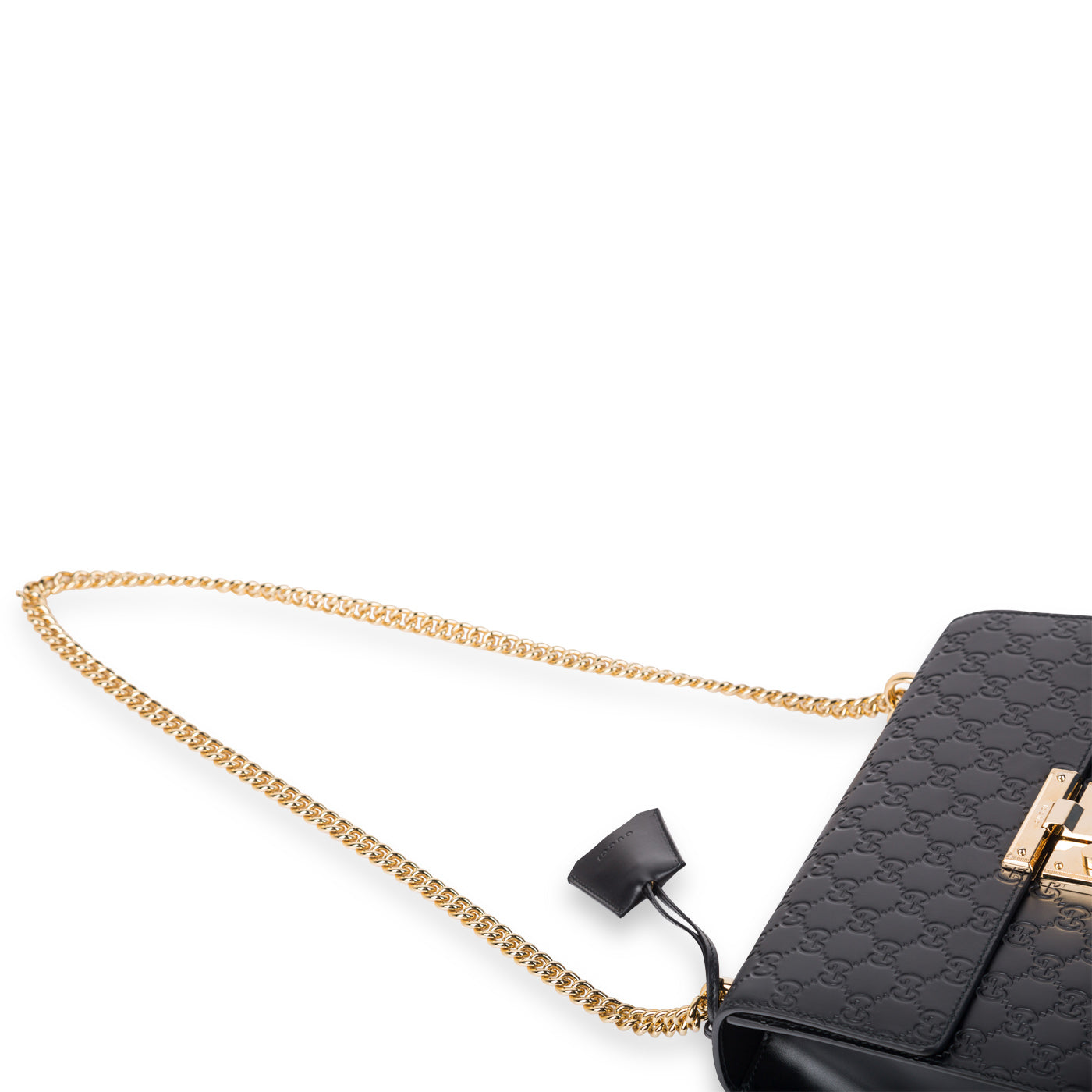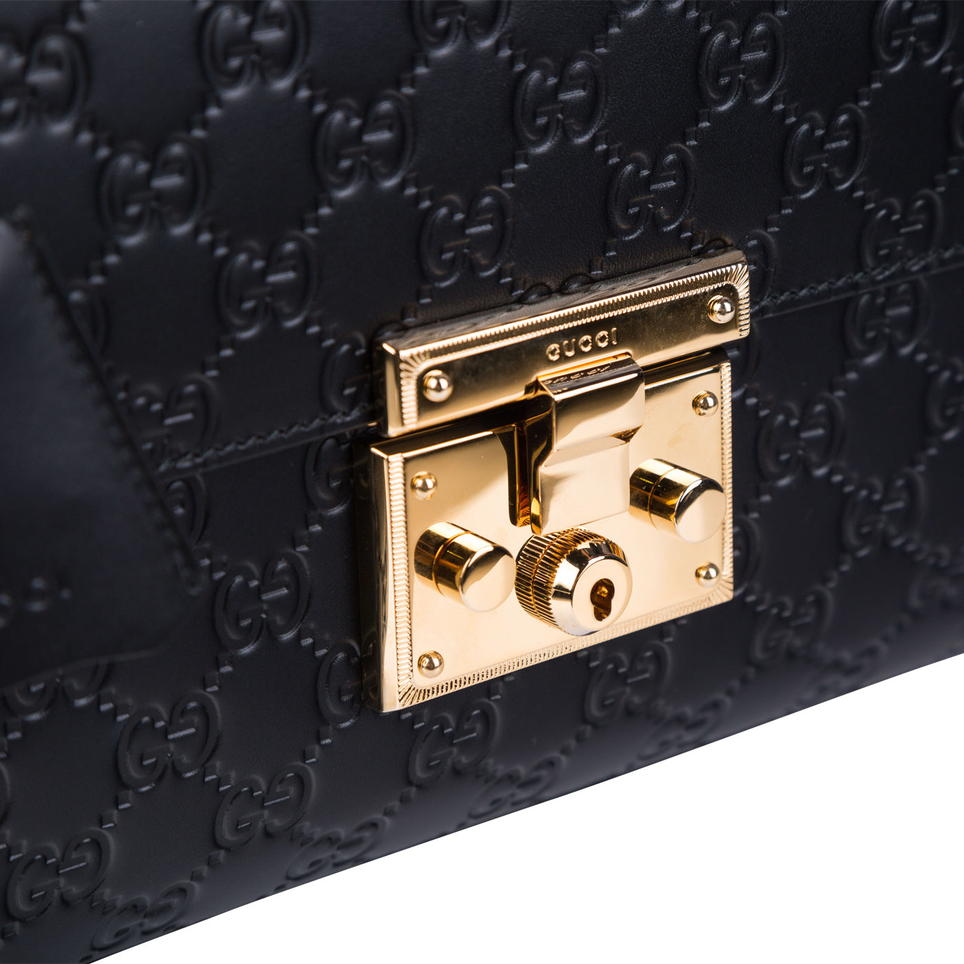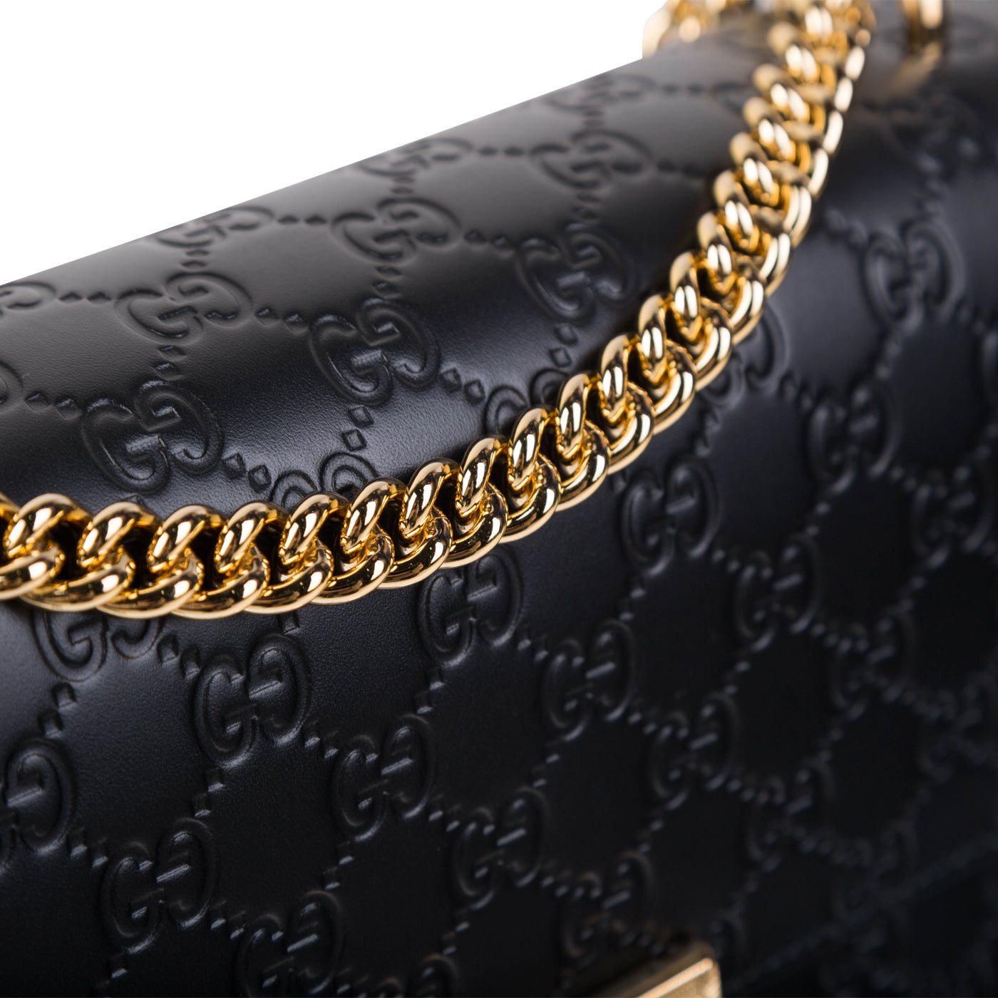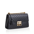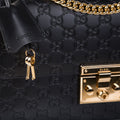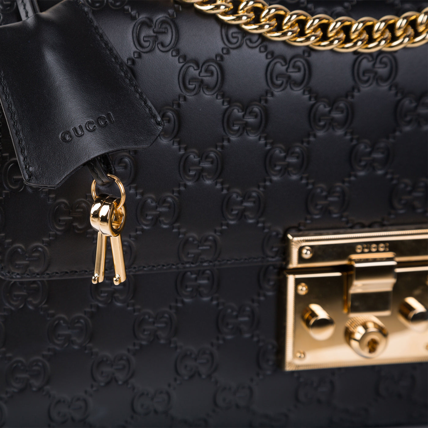 The ultimate shoulder bag for a classy and sophisticated woman with a love for luxury. Although the Gucci Padlock bag is a recognised style, it exudes discreet elegance and is the perfect option for a woman who appreciates understated glamour. With the signature GG monogram embossed into the black leather, romantic, gold-tone padlock, and chain strap, this bag is sure to compliment any outfit you wear it with. Whether you dress this bag up with a cocktail dress and heels, or down with trousers and a simple blouse, the Padlock bag is the right accessory for any occasion.