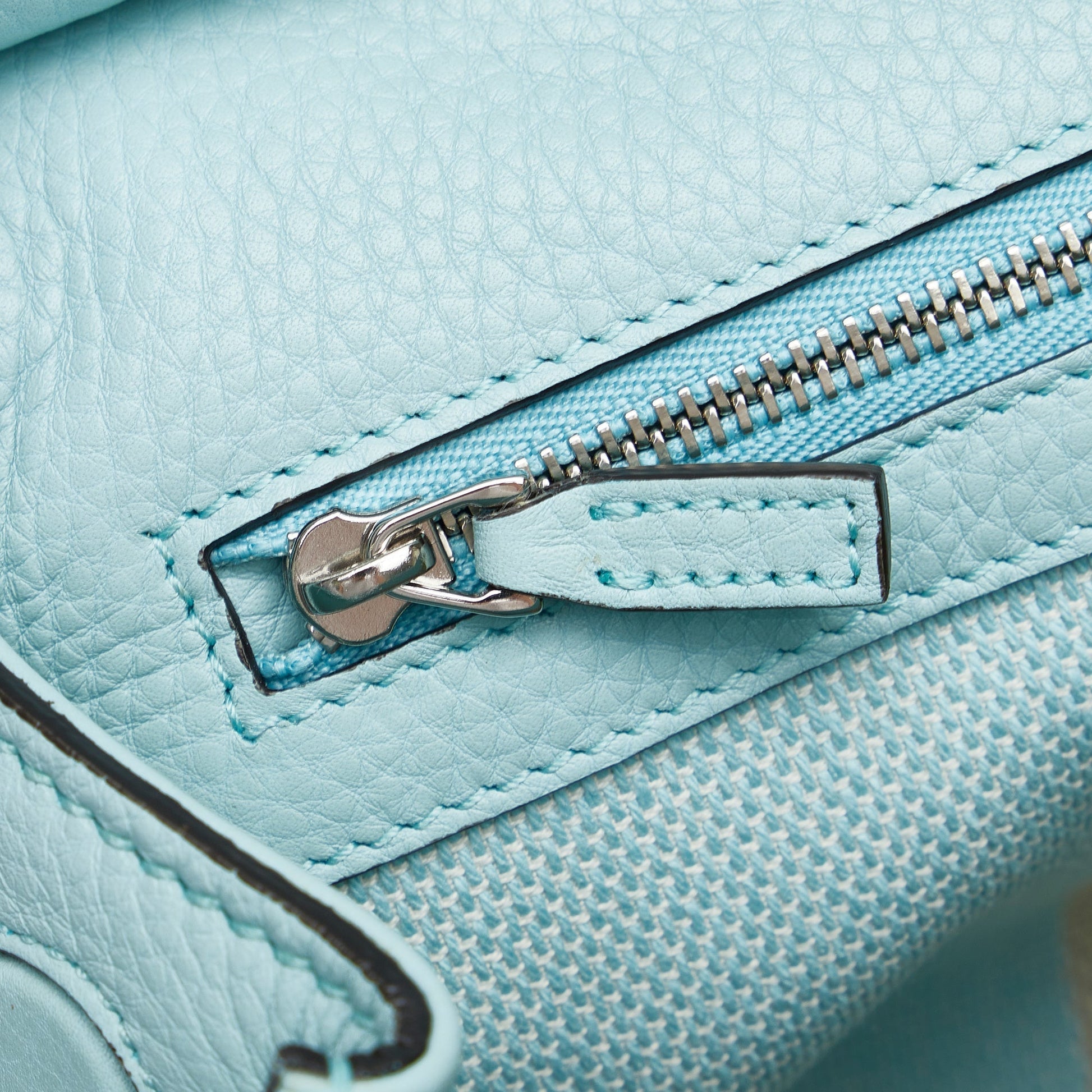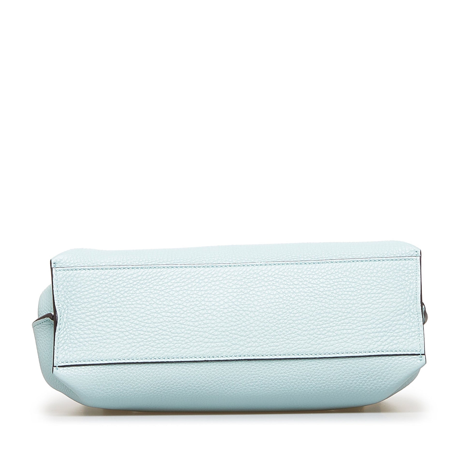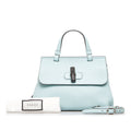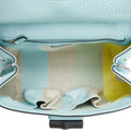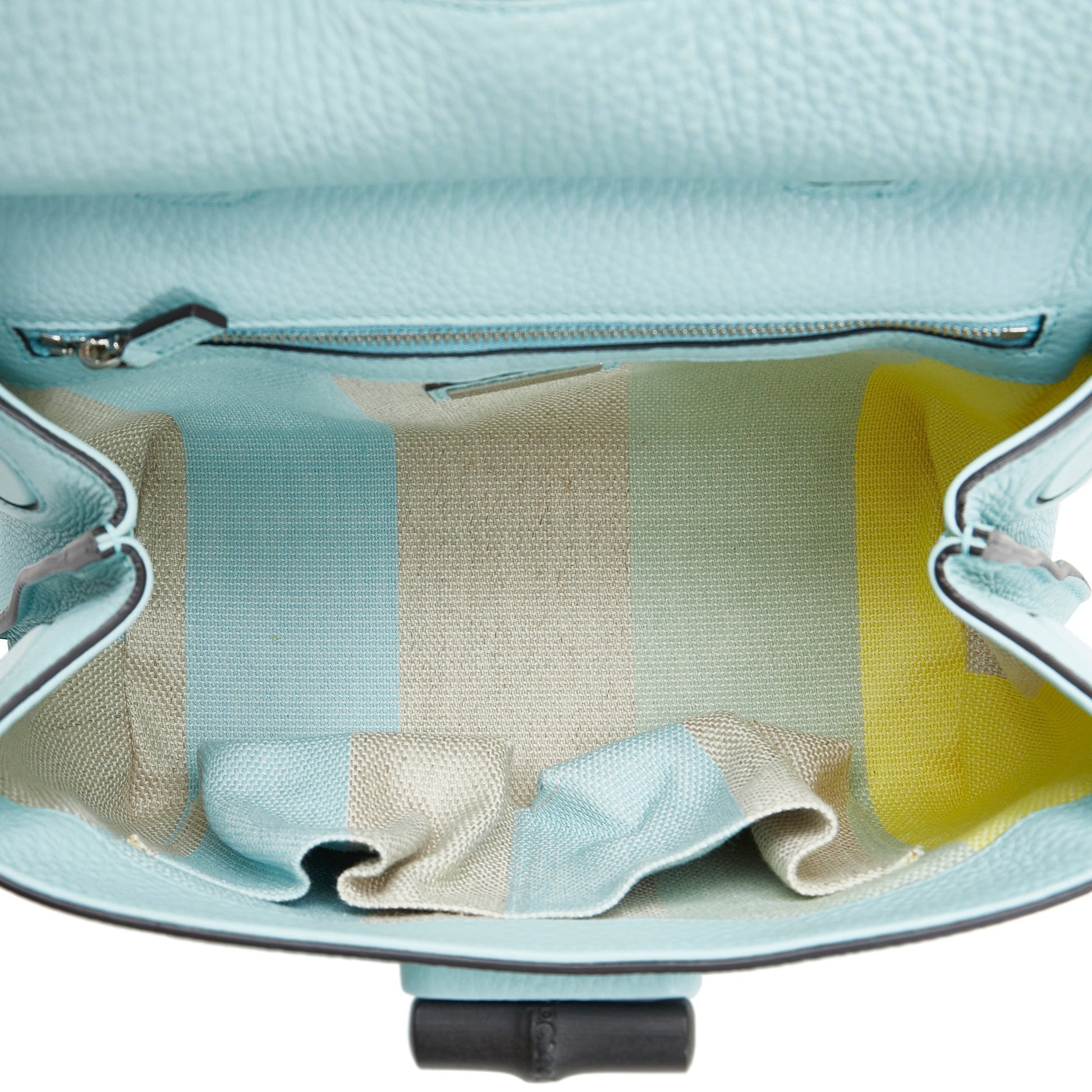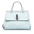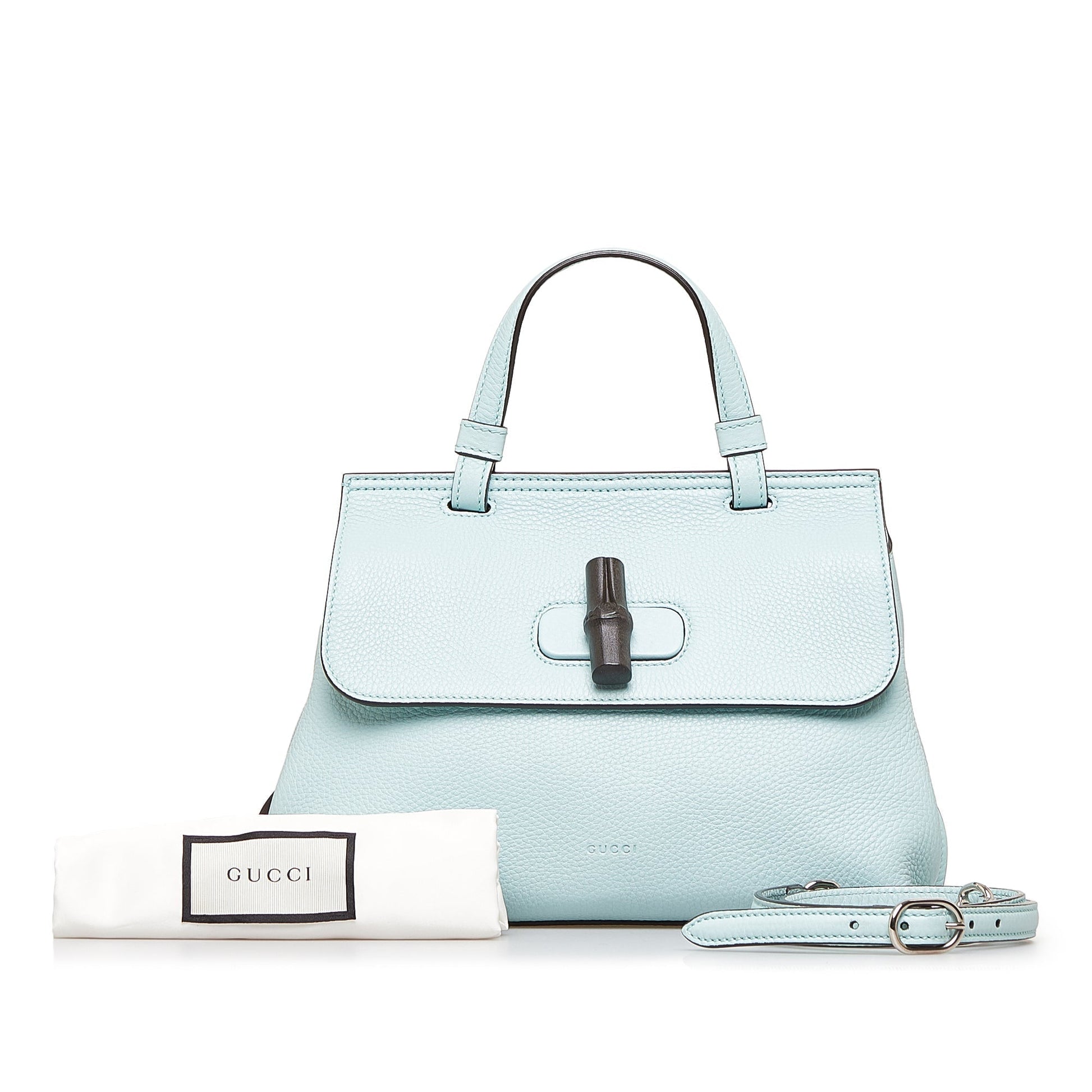 The Bamboo Daily features a leather body, a flat leather top handle, a detachable strap, a front flap with bamboo turn lock closure, and interior zip and slip pockets. Comes with dust bag