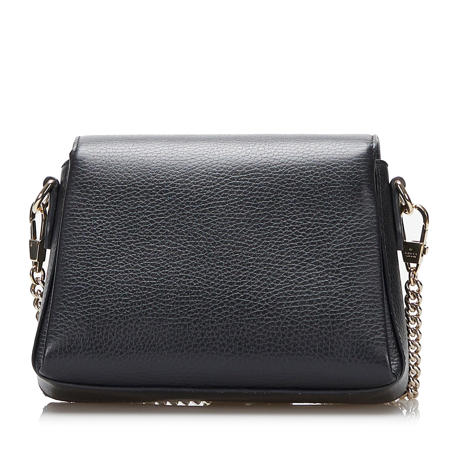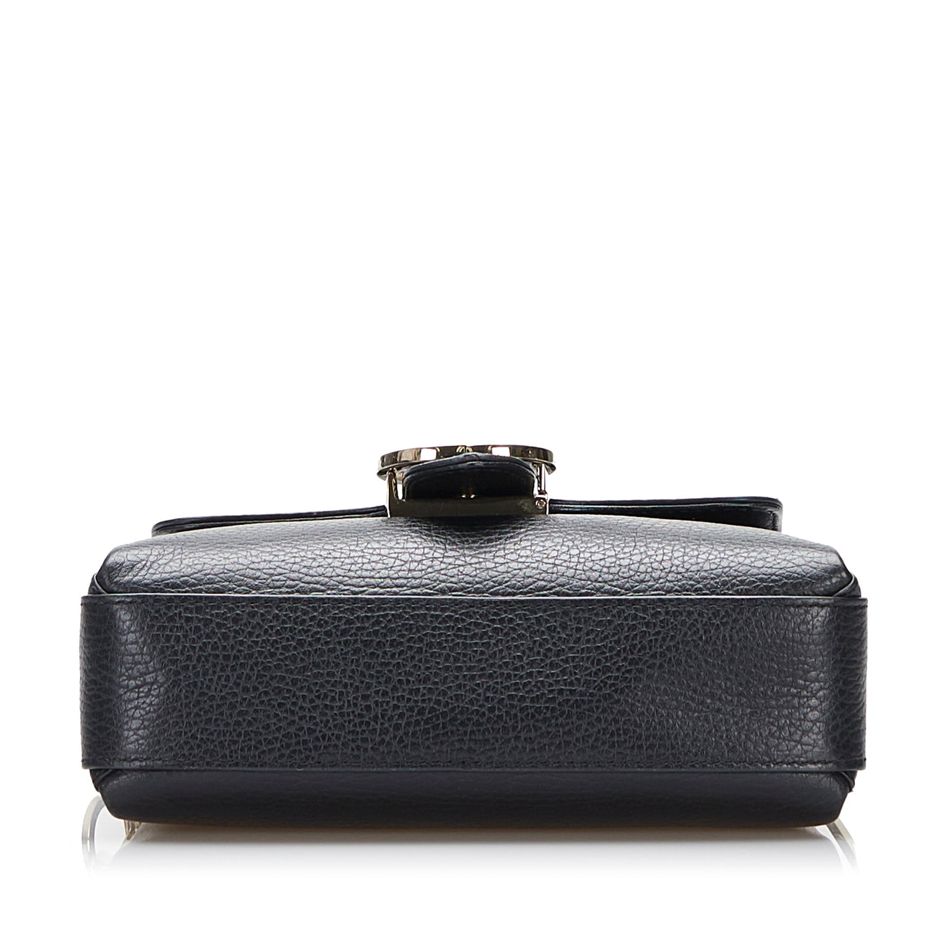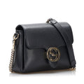 The Interlocking Dollar crossbody bag features a leather body, a chain-link shoulder strap with leather shoulder guard, a front flap with snap button closure, and interior zip and slip pockets.
