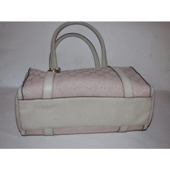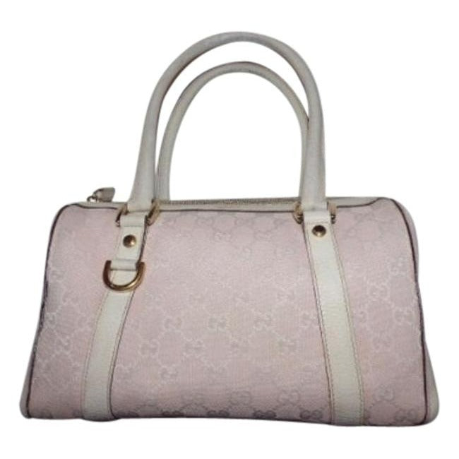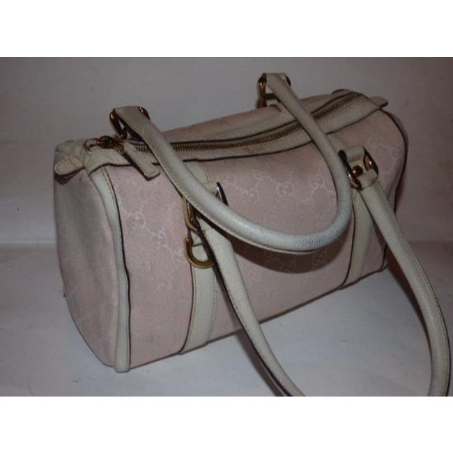 The bag is a satchel style purse with two straps. It has one interior compartment with smaller, interior pockets. This purse is called a 'Boston bag' style (I think) The purse has the large, double 'G' design in pale pink and white leather throughout. The straps, bottom, trim, and other accents are leather and the hardware is a polished, but muted gold tone.