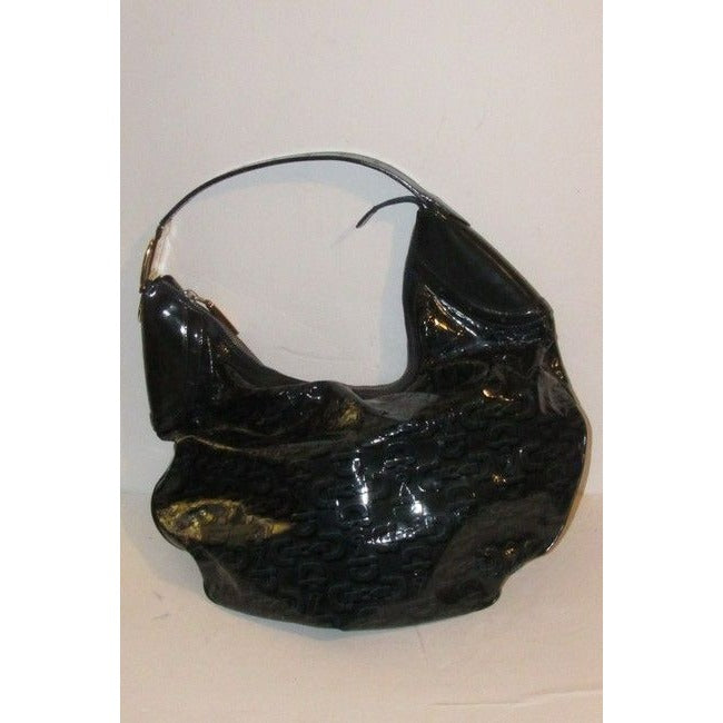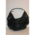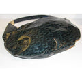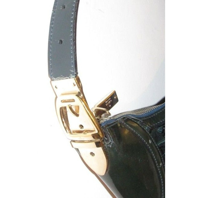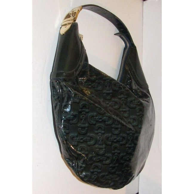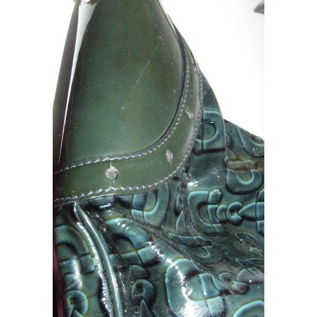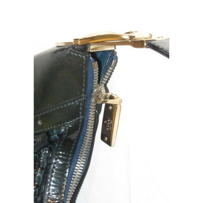 For sale is a RARE, Gucci, horse-bit print patent leather, XL 'snow glam' hobo style purse in shades of blue- green with green smooth leather accents, a top zip closure, a bold gold accent buckle at the strap, and a chic, bohemian look! It is a unique take on the classic hobo style that would be great used as a purse for everyday or as your go to blue bag!