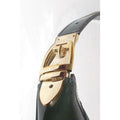The bag is an extra large, hobo style shoulder purse. The purse is made of what I would call a peacock blue color horse-bit print on an ocean blue patent leather with smooth spruce green leather accents and bold, polished gold hardware with an equestrian theme. The strap is not adjustable but has a bold gold buckle accent, which is gorgeous! It has a top zip closure with a large, engraved, gold Gucci fob on the zipper.