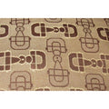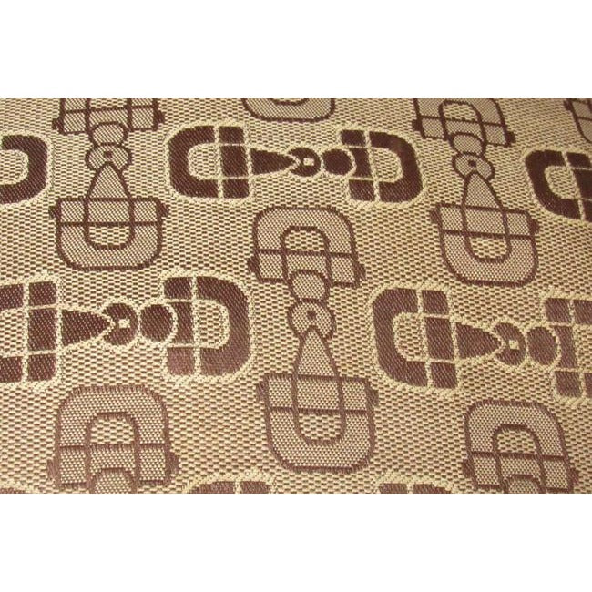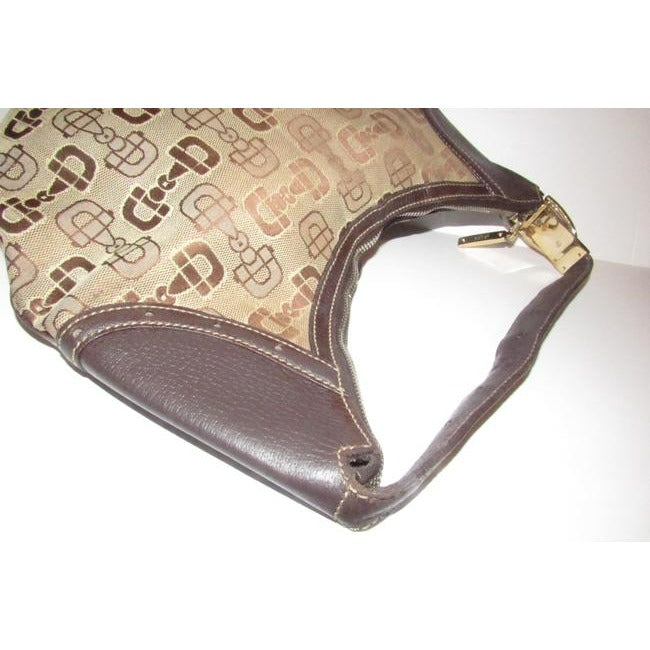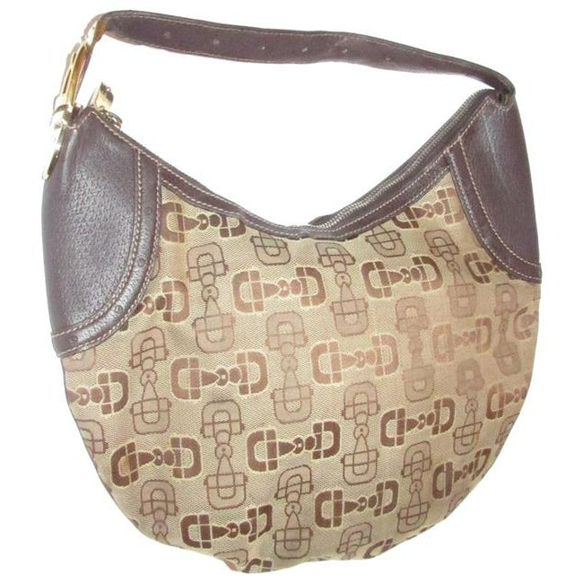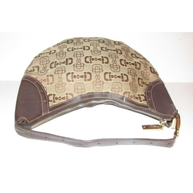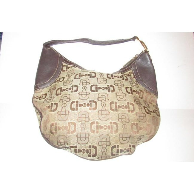The bag is a large, hobo style shoulder purse. The purse is made of brown horse-bit print canvas and brown leather and the hardware is bold gold tone with an equestrian theme. The strap is not adjustable but has a bold gold buckle accent, which is gorgeous. The purse was very lightly used, so the condition is amazing!