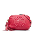 Let's go to the party! This cool Gucci Soho Disco Crossbody Bag is made of pink calfskin. On the front of the Bag is the iconic GG logo. The interior is equipped with slip pockets. With the long, flat leather strap can be the Bag comfortably crossbody wear. The top zipper is decorated with a leather tassel.