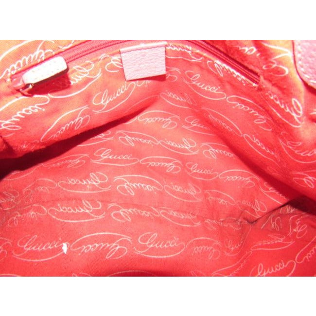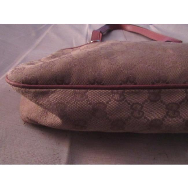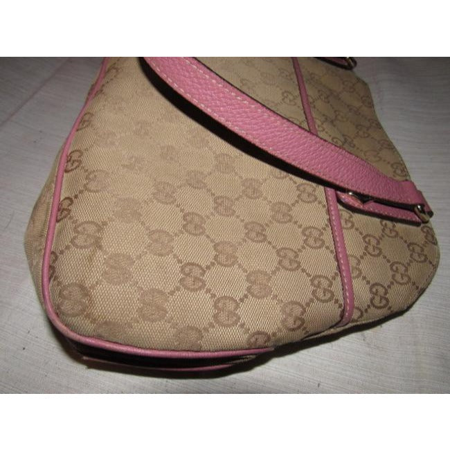 The purse is a snap top, satchel style shoulder or handheld bag. The body of the purse is fabric in the large G logo style fabric in brown. It has pink leather accents at the top, straps, and piping throughout. It has bold gold 'Gucci' button accents where the straps attach! It is a gorgeous purse with lots of room, perfect for an everyday signature piece! It is timeless and would work with any outfit!