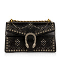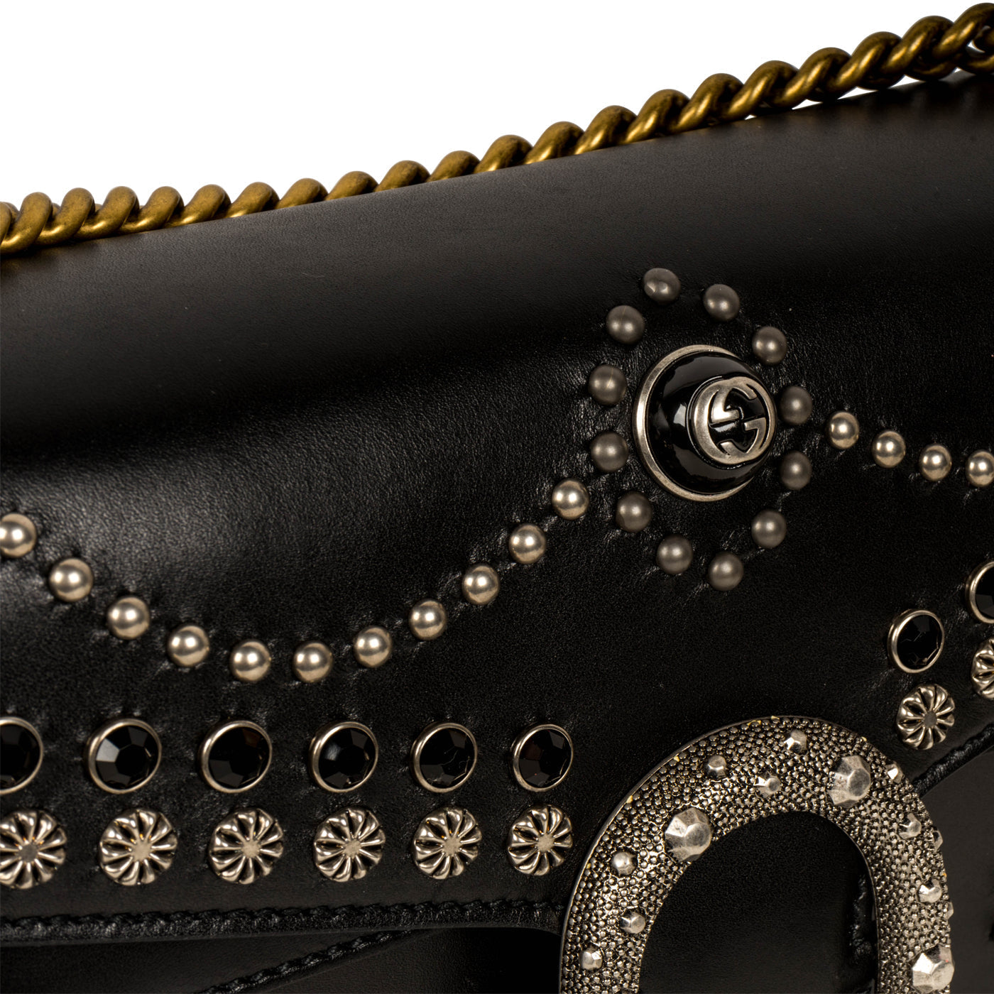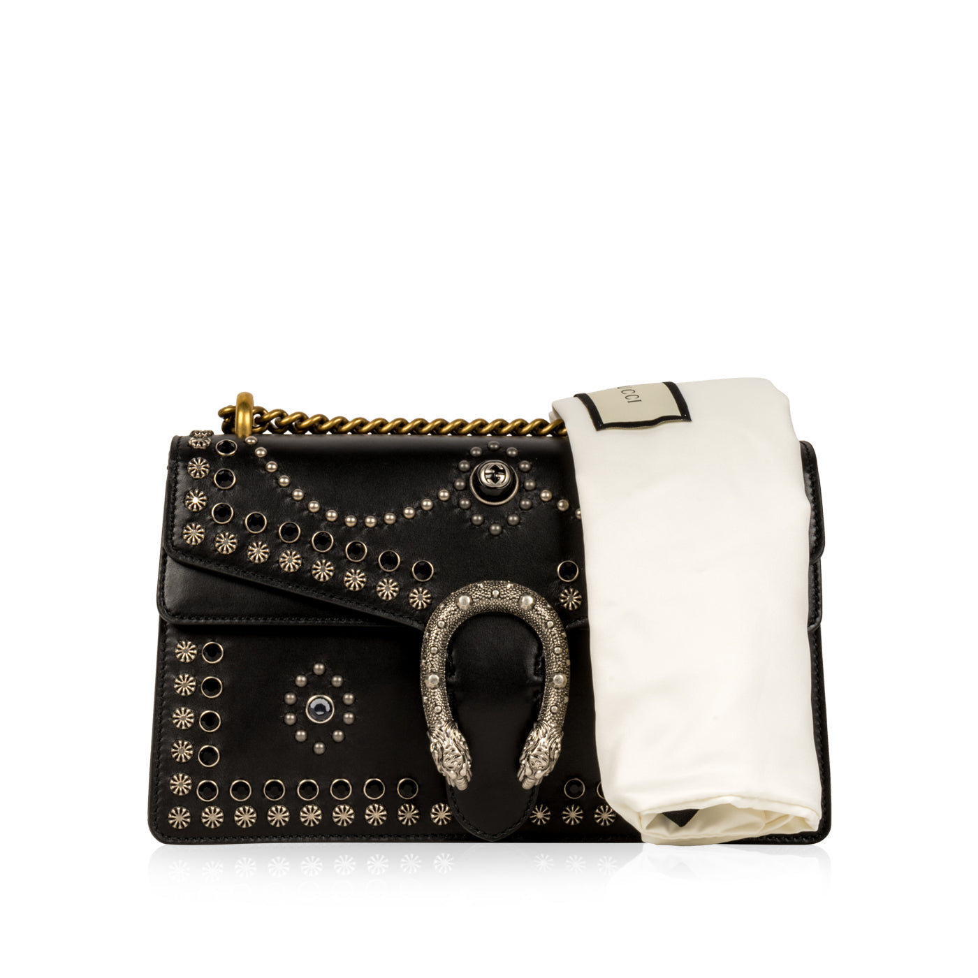 So pretty much, any fashion lover with a soft spot for Gucci needs this bag in their life. Carefully crafted from smooth black leather, this small Dionysus features black and ruthenium studded embellishment throughout - making it is the perfect accessory for basically any and every occasion. The perfect piece to dress up or down, this Dionysus is effortlessly chic in the coolest, edgiest way possible. Your new best friend that youƒ??ll never leave the house without, this studded baby is the ideal companion youƒ??ll bring along wherever you go. Night out? Running errands? Lunch with your girlfriends? No matter the event or occasion, Miss Dionysus is always the best plus one. Balancing refined elegance with a youthful and playful aesthetic, this rock nƒ?? roll Dionysus remains sleek and sophisticated while making heads turn wherever she goes. An instant classic the moment it hit the shelves, the Dionysus has become a Gucci timepiece that will never go out of style. A true must-have for any young woman with a fashion-forward sense of style and a love for luxury, this studded Gucci Dionysus isnƒ??t just a want - sheƒ??s a need.?ÿ