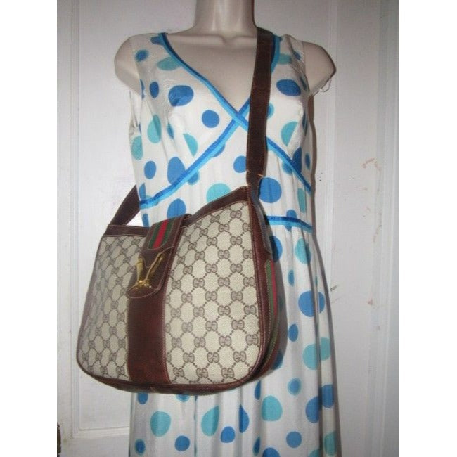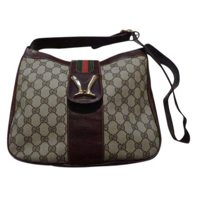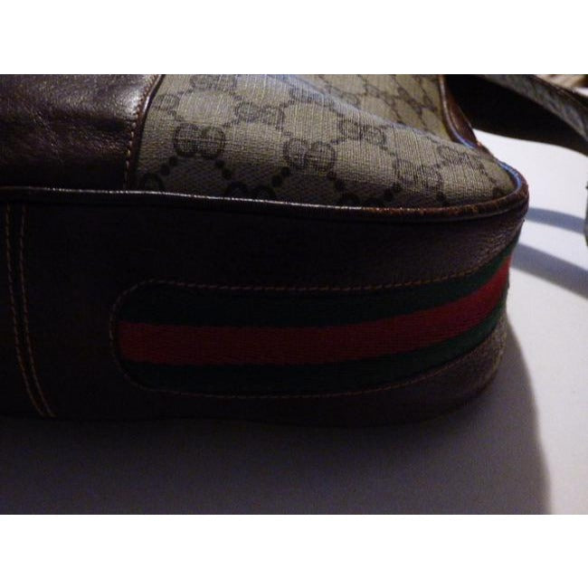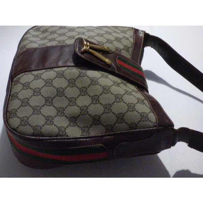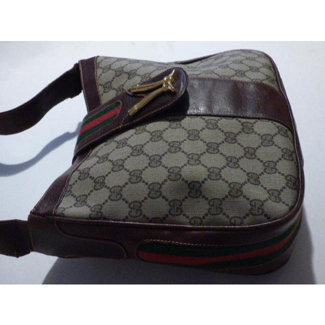 The bag is a large, open top, hobo style, bucket shaped purse. The purse is made of brown Guccissima print coated canvas and brown leather with red and green striped accents throughout! The frame and strap of the bag are made of brown leather. The purse is closed by a snap strap that has bold gold equestrian accent of abstract cowboy boots heel to heel!
