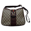 * For sale is a RARE, Gucci, brown leather and Guccissima print coated canvas hobo bucket style, shoulder bag with a red/green stripe accent, bold gold cowboy boot equestrian accent, top snap flap closure, and one of a kind Gucci style! It is a unique take on a classic style that would be great used as an everyday purse!