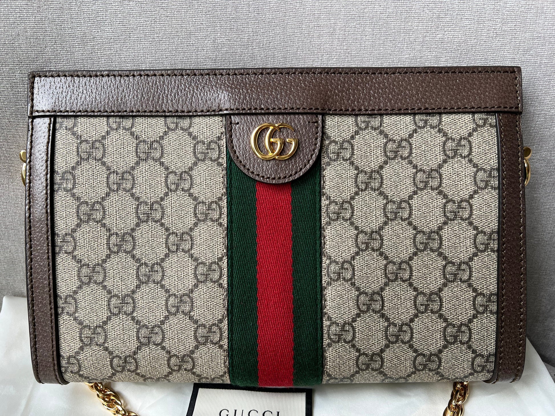 Gucci GG Ophidia Small Shoulder Bag in GG supreme canvas with gold hardware and brown leather trim. Featuring magnetic closure with two main compartments, it fits the essentials. Can be carried over the shoulder using chain strap (chain strap is too short cross body unless petite in size).
