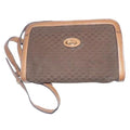 The bag is a logo, monogrammed, small 'G' style in brown. It has a cross body/shoulder strap and is a classic, rectangular shape with a zip clasp at the top. It has camel colored leather comprising the top, bottom, sides, body, and strap with the small G logo design fabric as the front and back.
