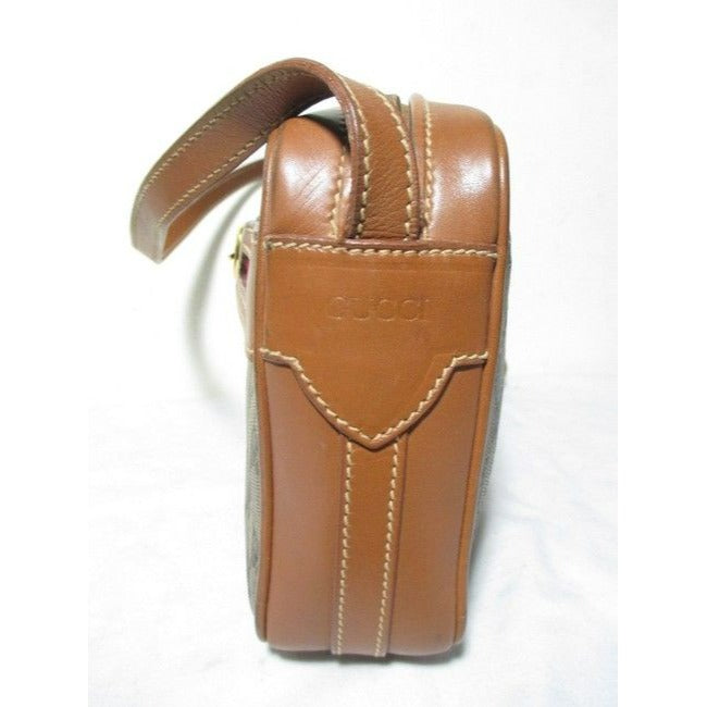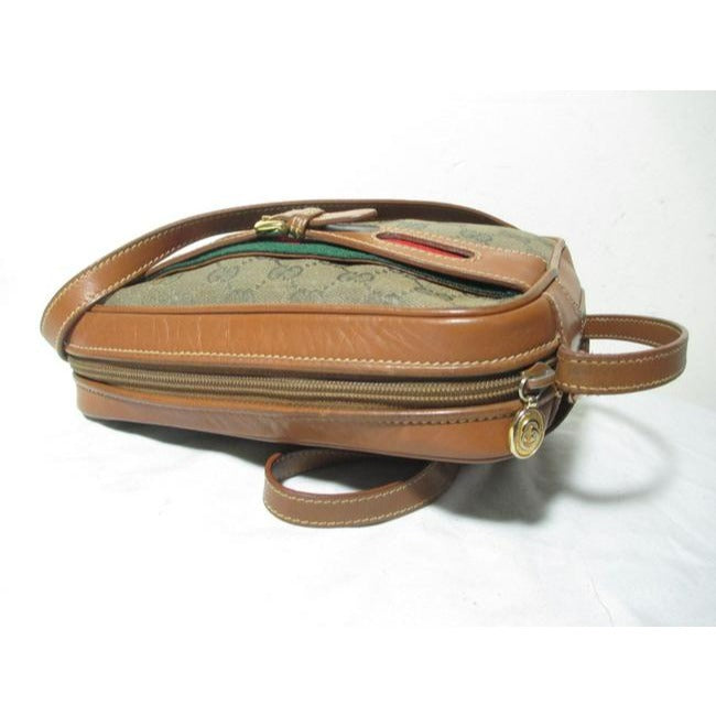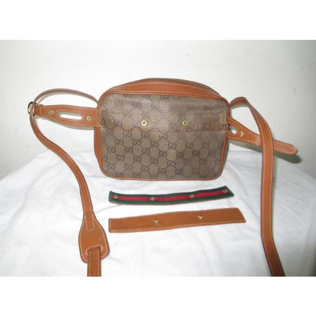 This is a gorgeous, rare piece from Gucci that has some one took extremely good care! This is a fabulous bag by Gucci! The bag is made with the large 'G' logo print canvas and brown leather. The top, sides, bottom, and strap of the purse is a supple brown leather and the front and back are brown canvas with the large G logo print! On the front is the truly unique part- . It has a red and green striped ribbon or leather strip that attaches by snapping onto the purse and being secured into place with a petite buckle. It is a square, classic, shape with a zip top closure. It has a leather adjustable strap and can be a cross body or shoulder bag with gold hardware.