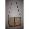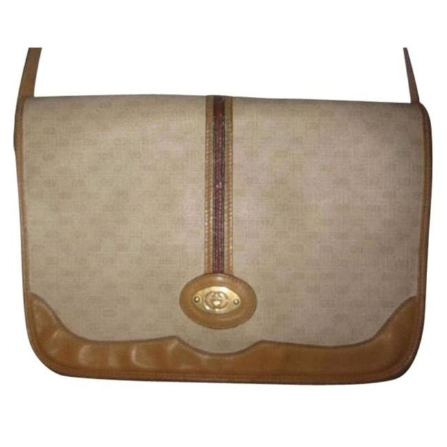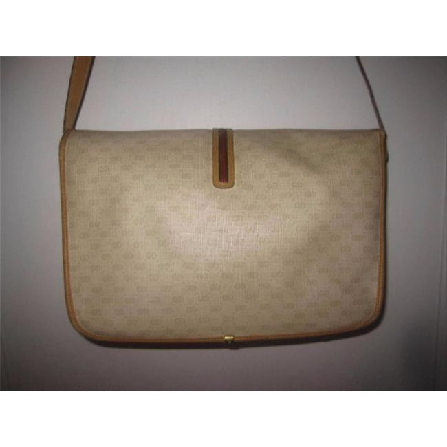 The bag has a cream coated canvas body with a small 'G' logo design and camel color leather. It has a long shoulder strap and is a classic, rectangular shape with an envelope style top. The matching leather frames the purse- on the interior, piping, bottom of the front, and as the strap. In the center, it has red, green, and tan leather accent stripes that end at the gold tone 'Gucci' oval plaque!
