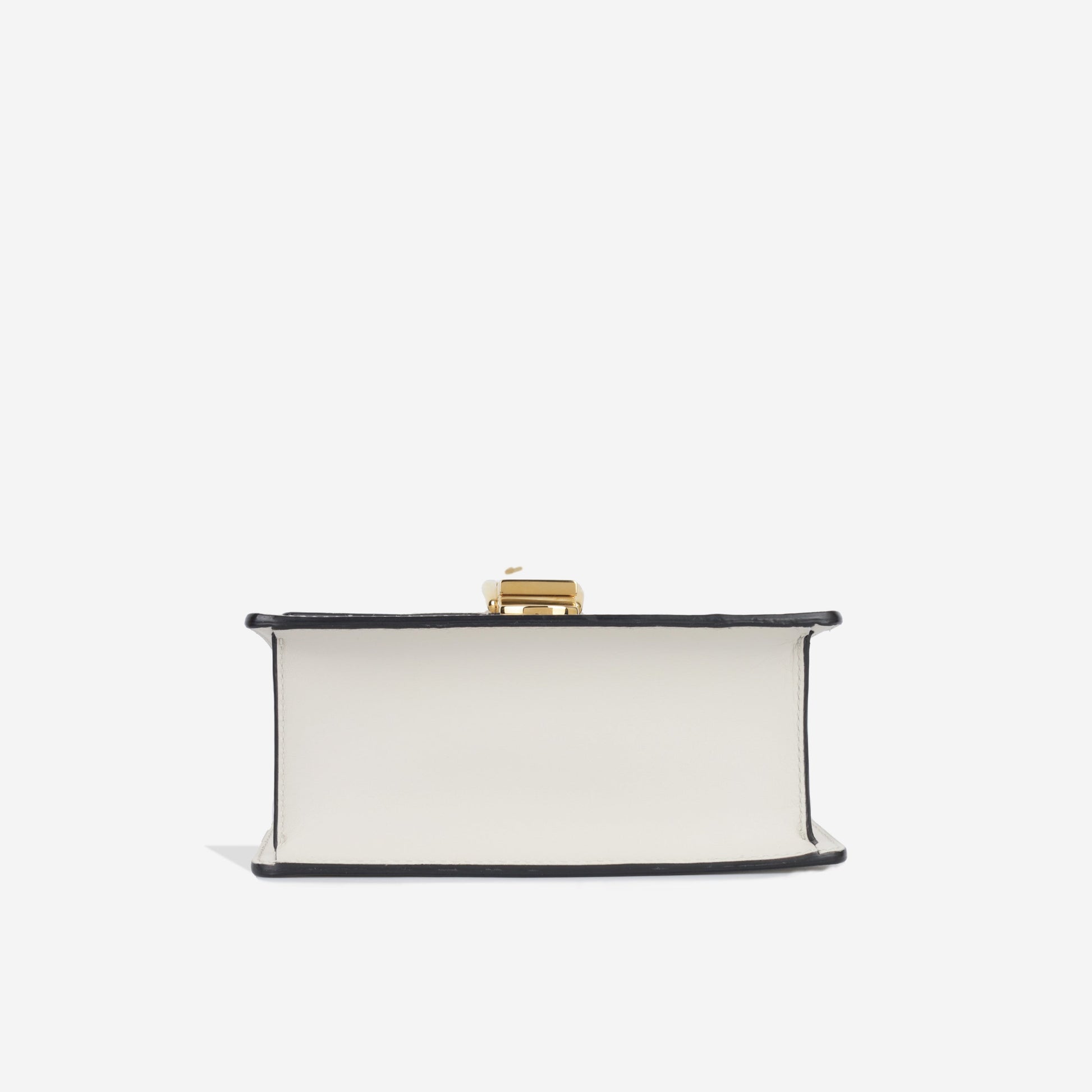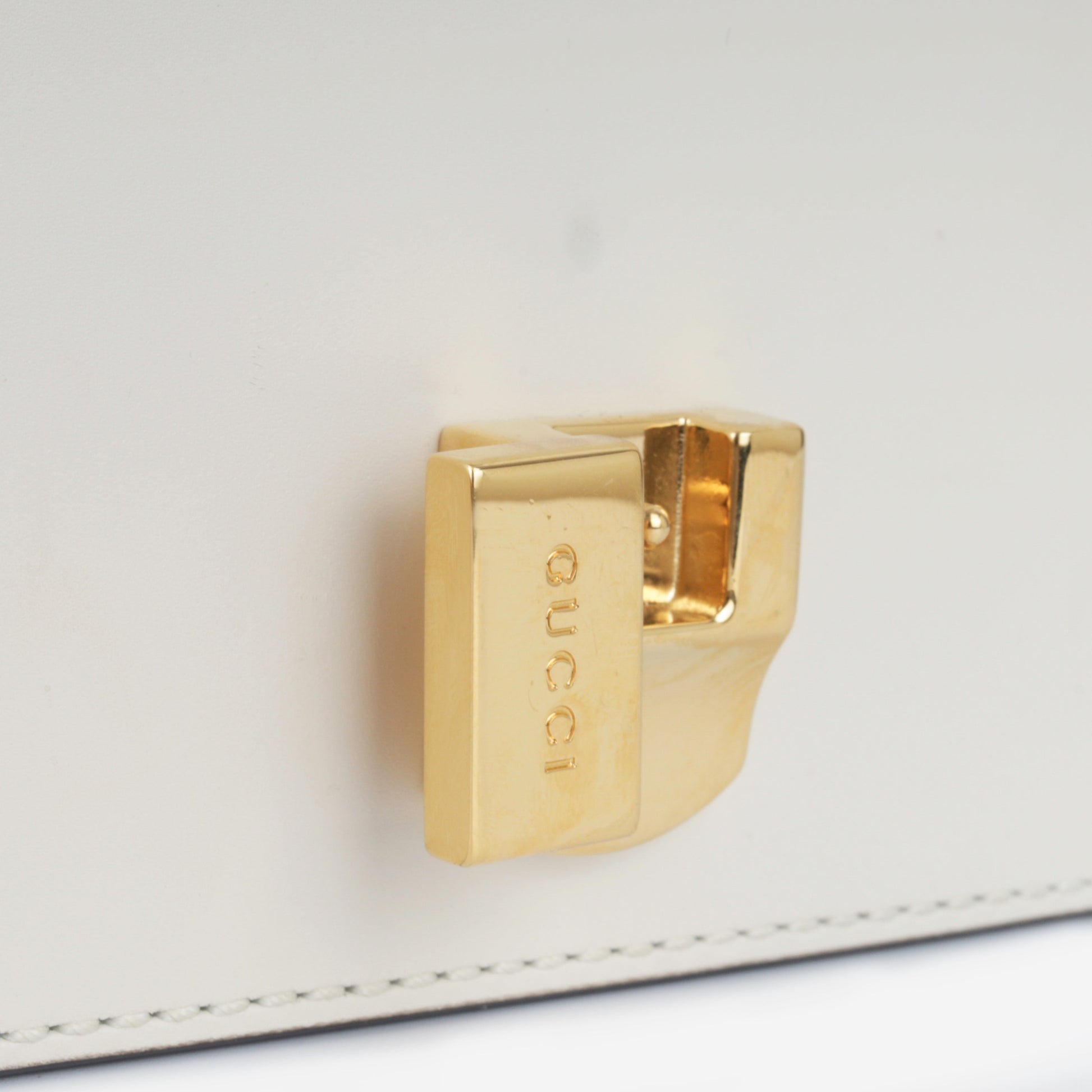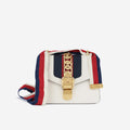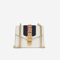 The Gucci Sylvie became an instant classic the moment it landed in stores. The bag is complimented by the brand's signature red and blue striped ribbon handle and also features a removable leather shoulder strap. This stunning bag is an absolutely necessary addition to any luxury handbag collection. With a gold buckle chain prominently depicted on the front flap, the Sylvie is luxurious, glamorous and the perfect compliment to anything you may have in your wardrobe.