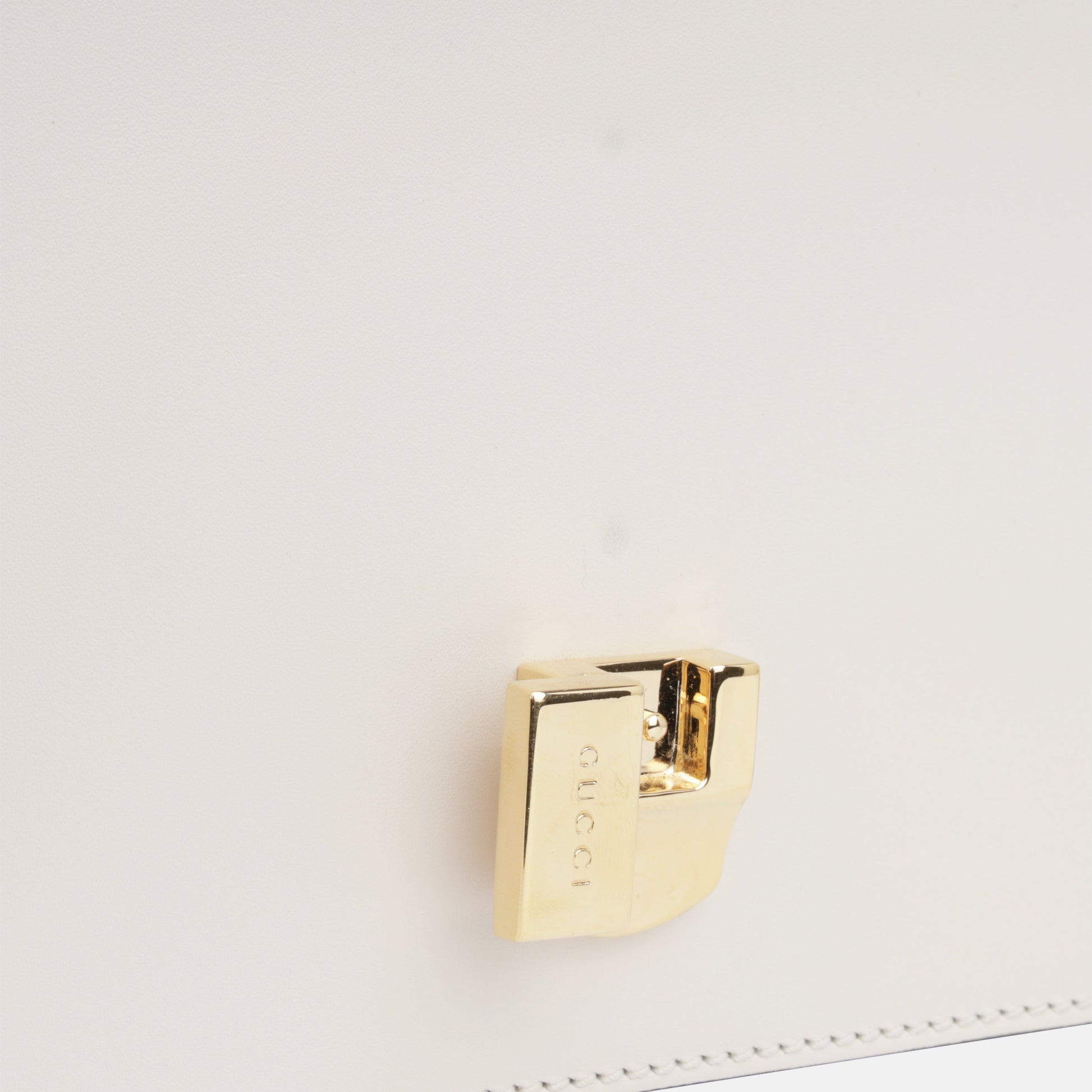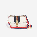 The Gucci Sylvie became an instant classic the moment it landed in stores. The bag is complimented by the brand's signature red and blue striped ribbon handle and also features a removable leather shoulder strap. This stunning bag is an absolutely necessary addition to any luxury handbag collection. With a gold buckle chain prominently depicted on the front flap, the Sylvie is luxurious, glamorous and the perfect compliment to anything you may have in your wardrobe.