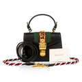The Gucci Sylvie is one of those bags that became a classic the moment it landed in stores. Featuring the brand’s signature green and red front fabric stripe, a white, blue and red woven fabric strap and an additional black leather shoulder strap, this mini Gucci baby is an absolute must-have. With a gold buckle chain prominently depicted on the front flap, the Sylvie is luxurious, glamorous and the perfect accessory to compliment to anything you may have in your wardrobe. Whether you dress the Sylvie up or down, you can be sure this “understated statement” is the ideal accessory for any occasion. Sleek, stylish, sophisticated, but youthful and playful at the same time, the Sylvie is a well-worthy addition to any luxury handbag collection.