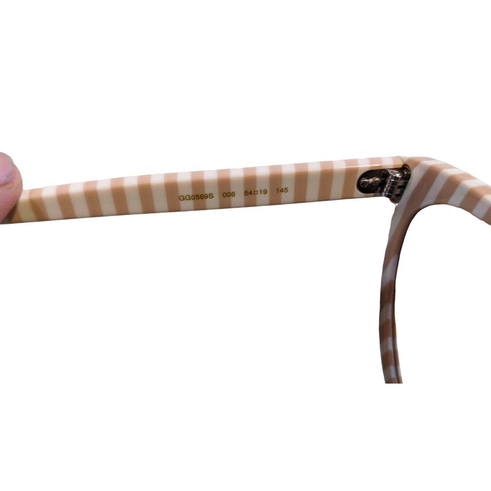 On the interior of the frame it reads ' GUCCI, Made in Italy CE' on one side and 'GG0569S 006 54 19 145' on the other side. Their size is 54 19 145.