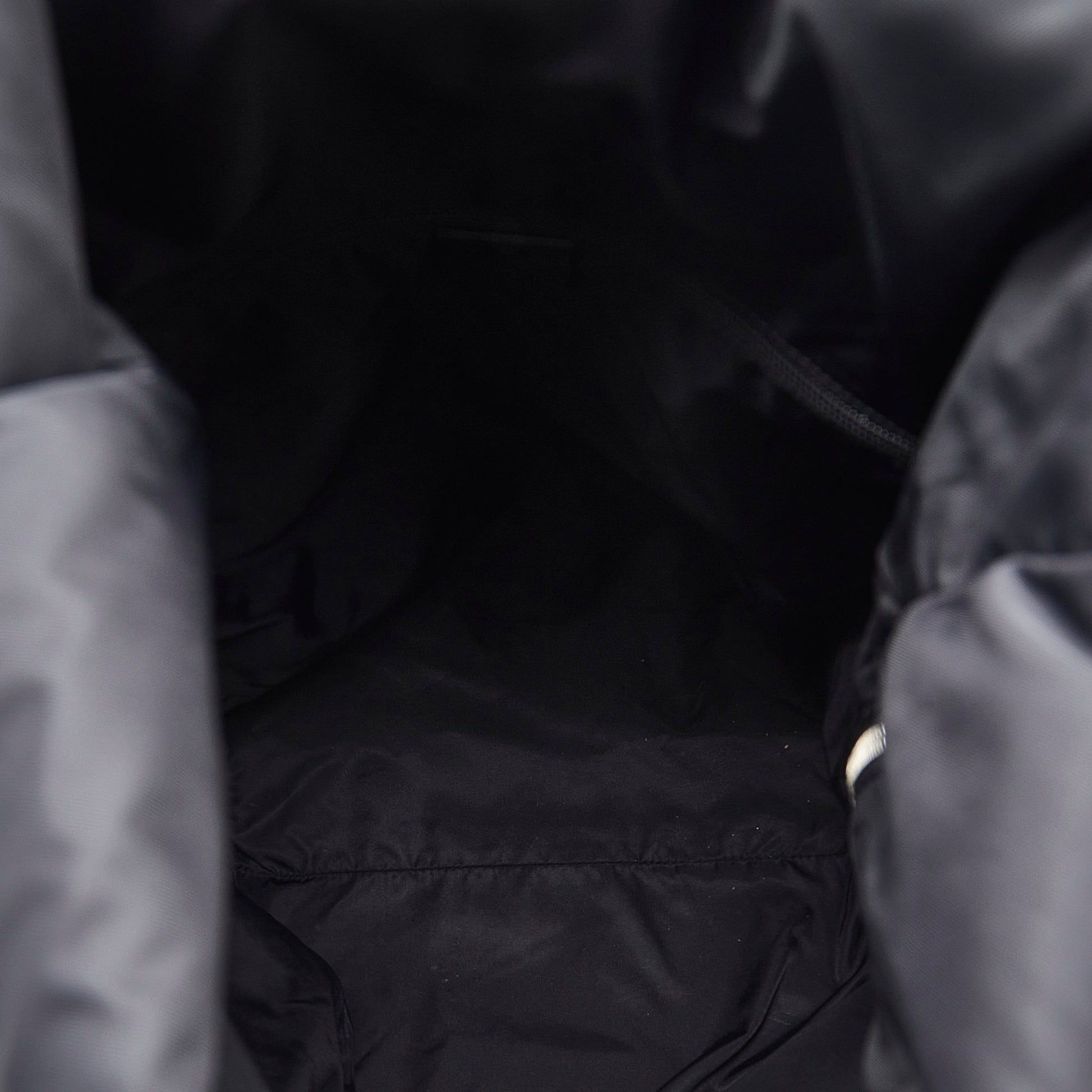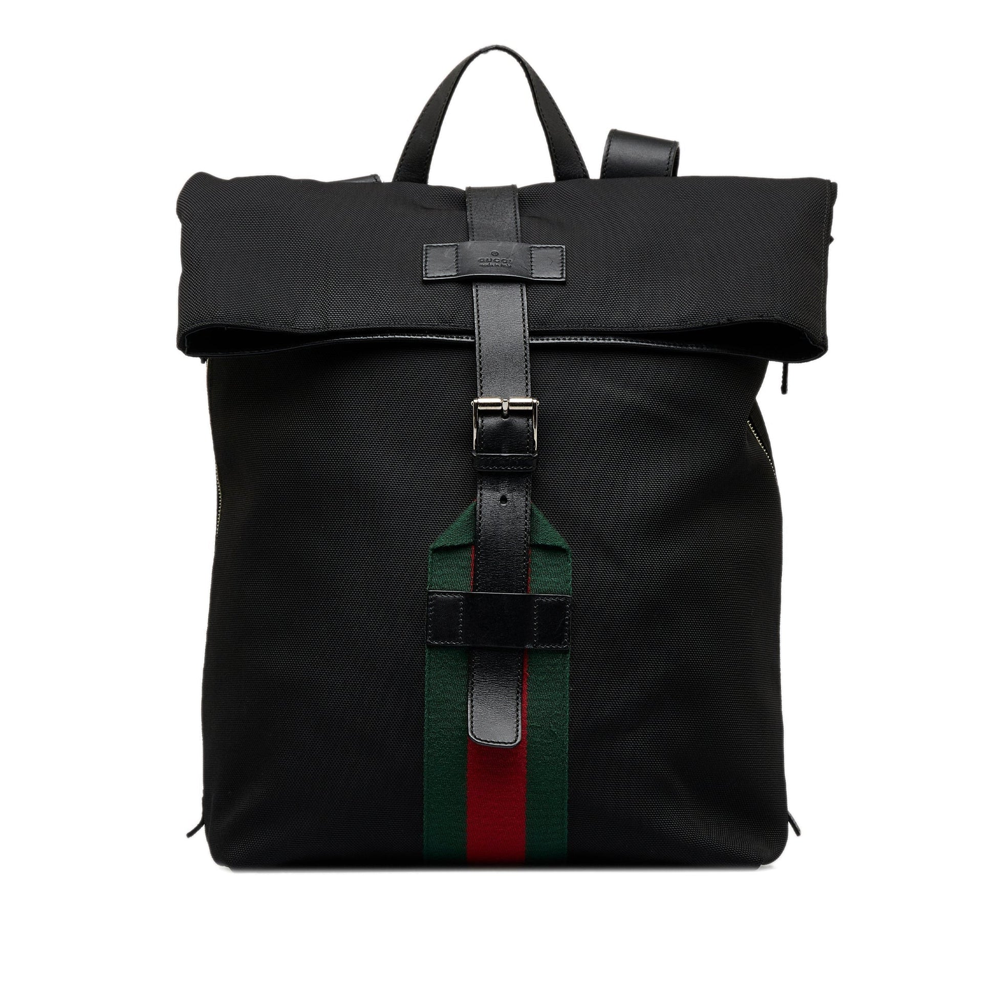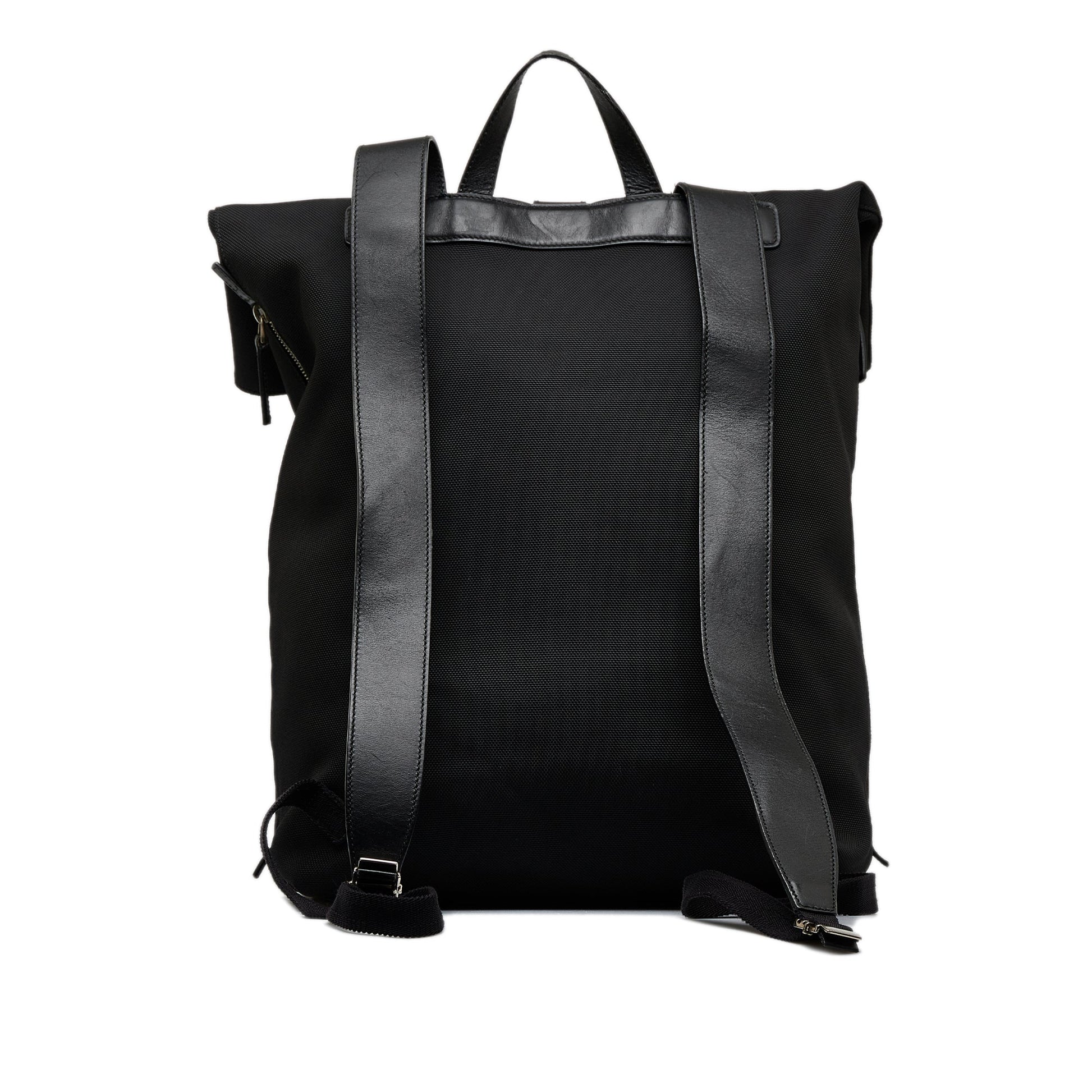 This backpack features a canvas body, a flat top handle, a flat adjustable shoulder strap, a top flap with buckle closures, a drawstring closure, and an interior zip pocket.