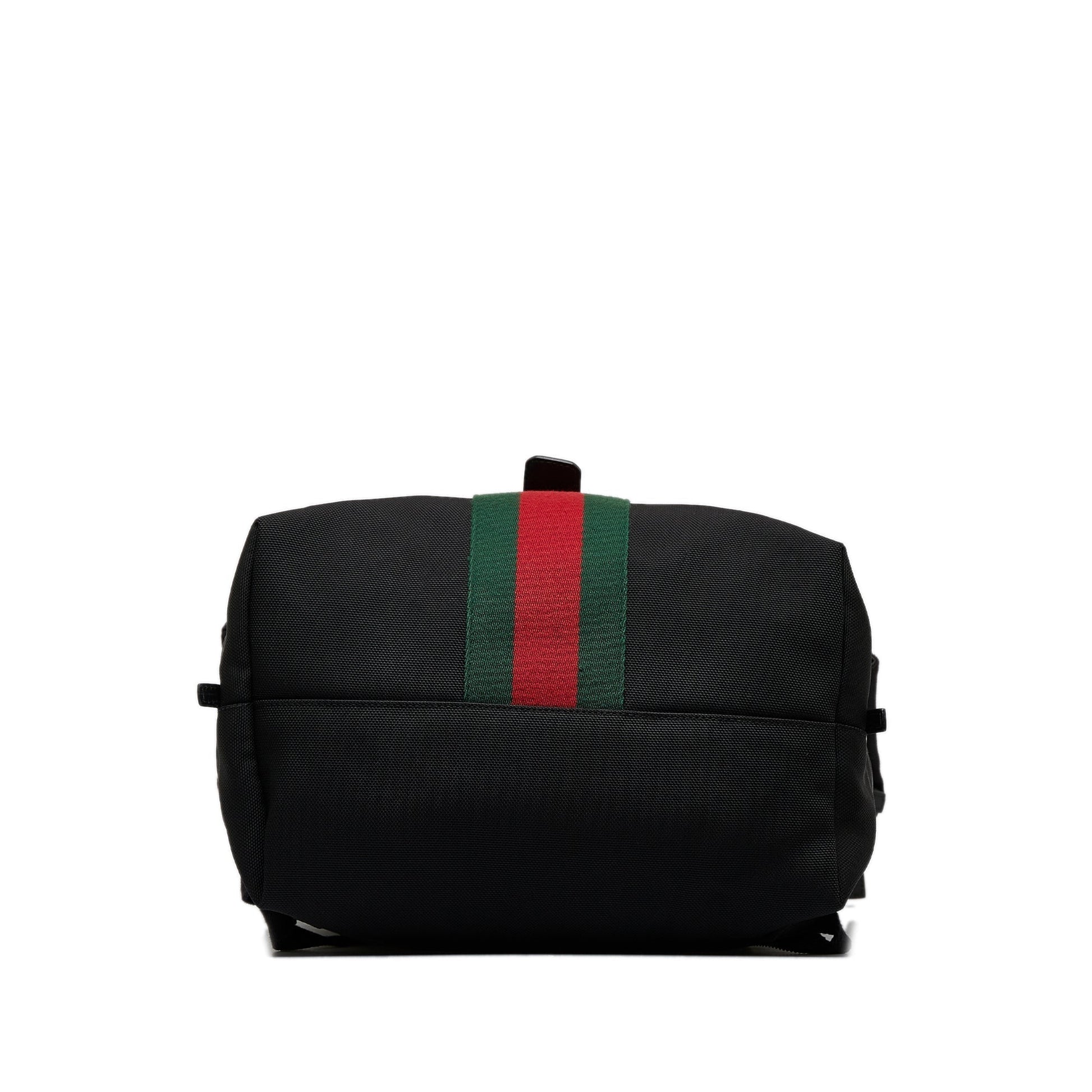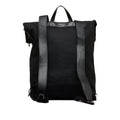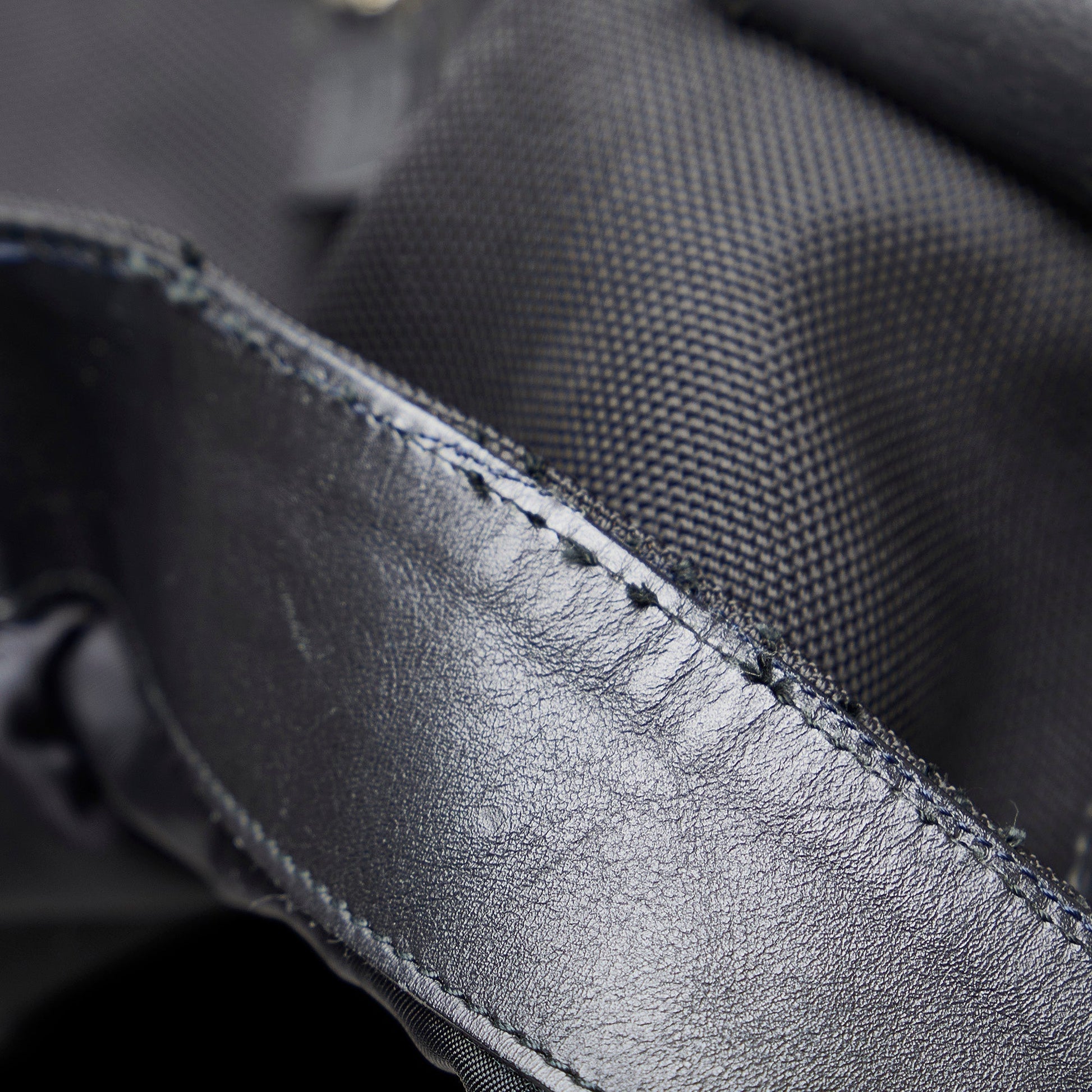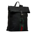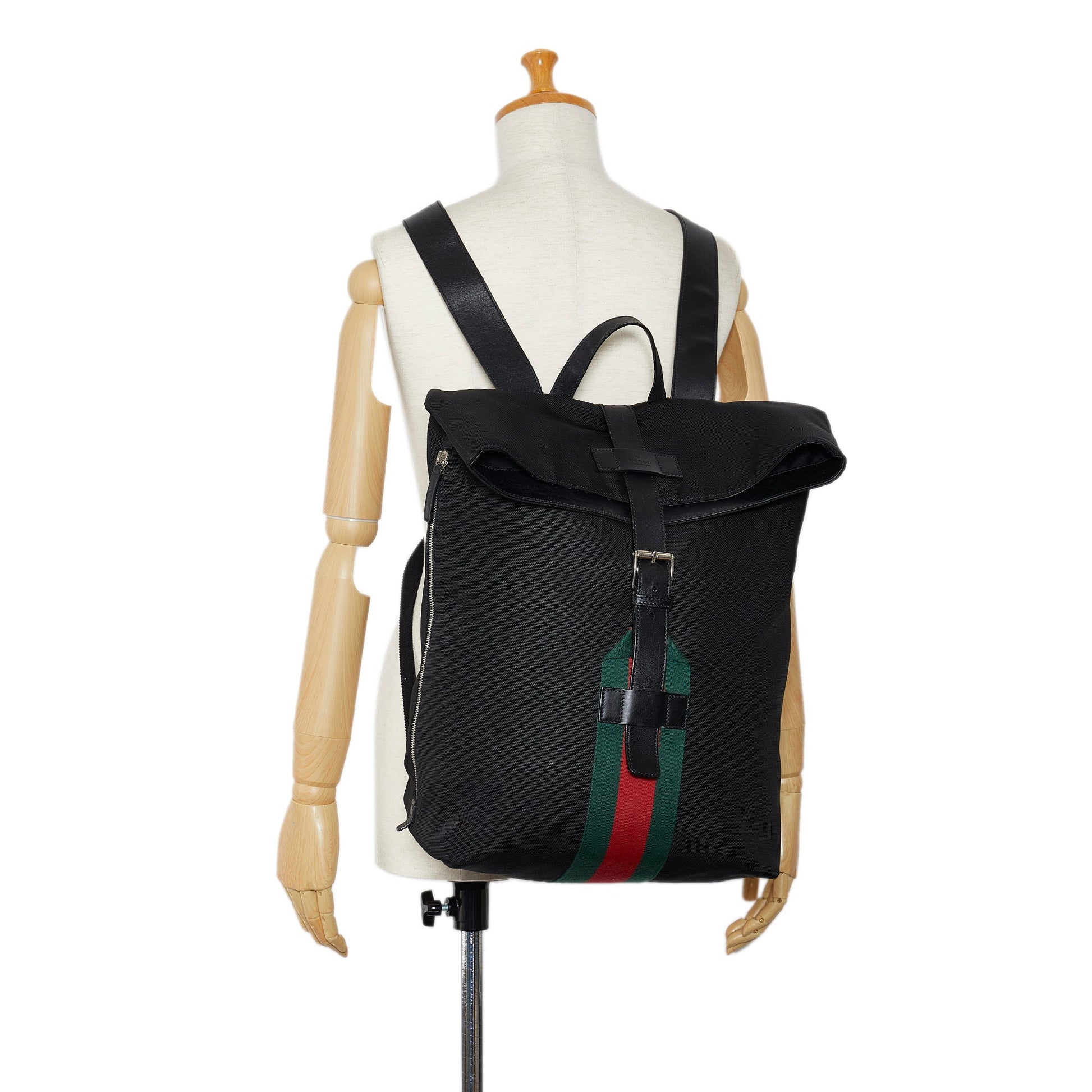This backpack features a canvas body, a flat top handle, a flat adjustable shoulder strap, a top flap with buckle closures, a drawstring closure, and an interior zip pocket.