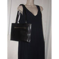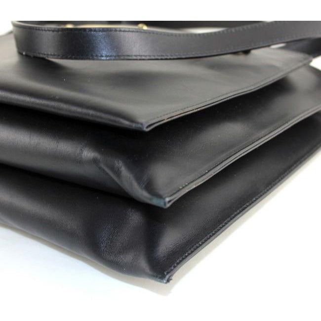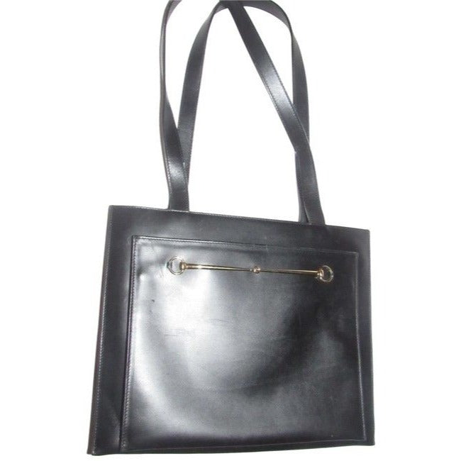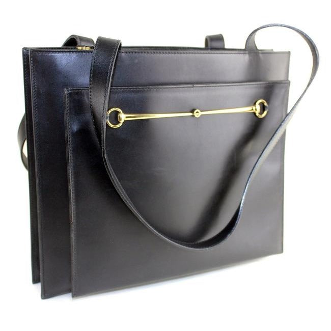This vintage piece is made from the softest, black glossy leather and has bold gold equestrian inspired accents! The bag is a large satchel or tote style with multiple compartments- the center and largest one having a zip top closure, a snap close exterior front pocket, and tons of space to keep you organized! It is a shoulder purse with two longer straps. This purse is designed in such a smart design to make use of space and still look edgy and sharp! The purse, I believe, is from Tom Ford's time designing for Gucci in the 1990's. It is a perfect size, everyday, black purse!