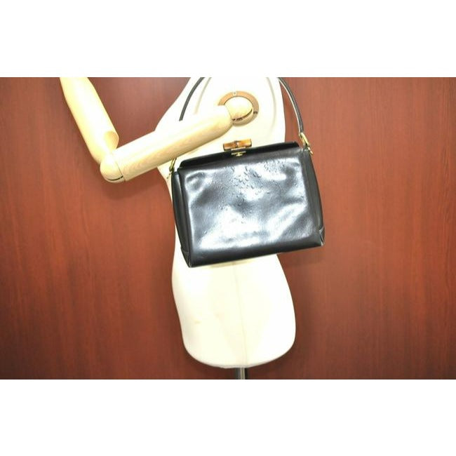 The bag is a shoulder style purse by GUCCI in a rare, all leather style. It is made from a glossy dark navy blue leather with bamboo and gold tone hardware and has a snap top closure. There are bold, polished gold, accents on the sides and at the top exterior of the snap closure is a bamboo accent. It has the mint condition, original, navy blue leather snap close pouch with a mirror inside that you could easily use as a wallet or change purse! There is the detachable cross body strap, too, to give you two different looks!