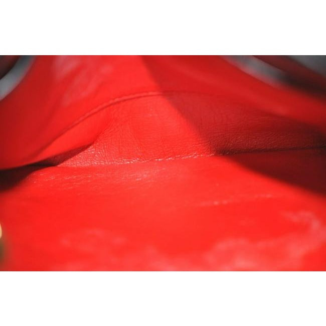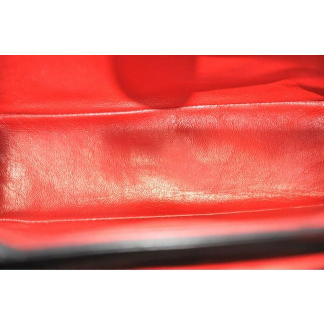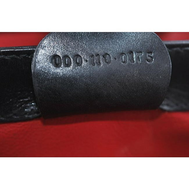 Inside, it has three layers of compartments to allow it to hold more than you may think. The red and navy blue leather lined interior has lots of slit and zip pockets and three compartments to keep you organized and is very clean. Above one of the pockets is a leather tag which is embossed in gold on the front with 'Gucci, Made in Italy' and it is embossed with the serial number 000 110 0175 on the back.