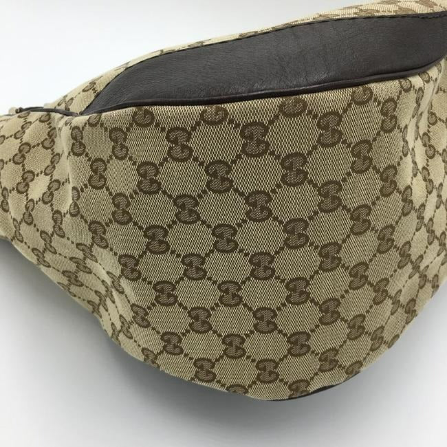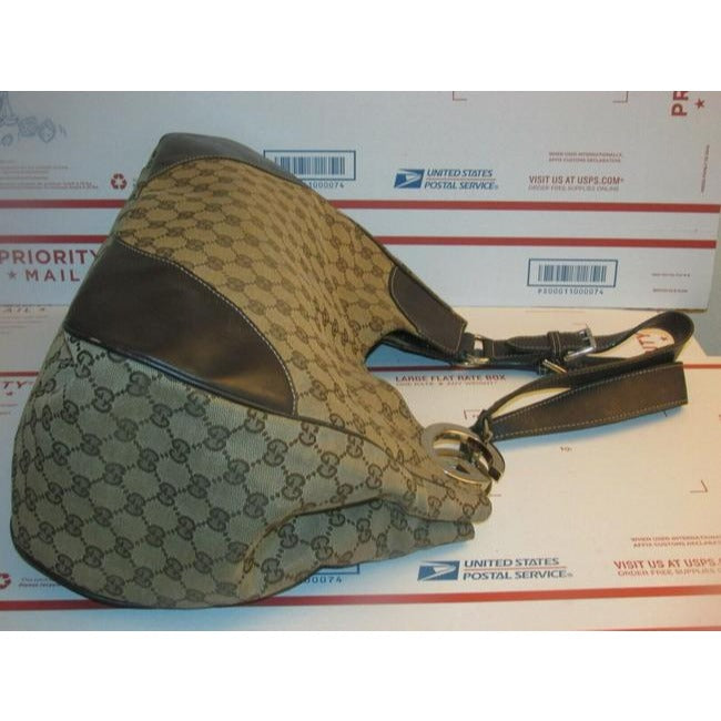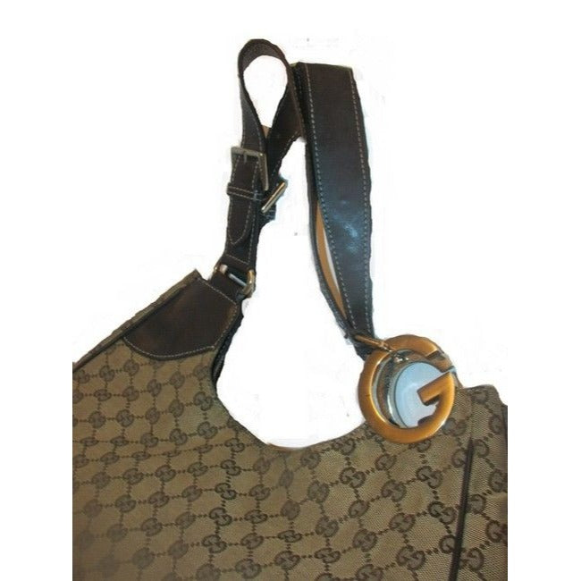 The bag is made of brown Guccissima or large 'G' style logo print canvas and brown leather with gold tone hardware. It has two leather handles that attach to the two large solid gold Gs on one side- see pictures- and have a buckle to adjust their length on the other side. The tote has leather straps, leather trim along the bottom, leather corners, and a leather lined interior top. It has snaps on both sides that would allow it to hold less or expand - see pictures- and a snap top closure. The purse is so chic and stylish, yet practical!