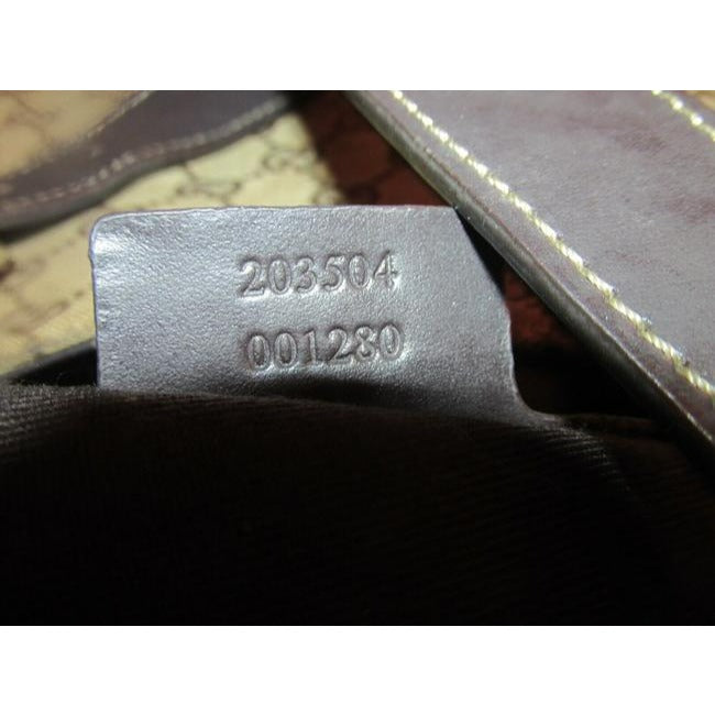 Inside, it is lined with a soft brown fabric lining that is very clean! On the interior, there is one large compartment with smaller slot and a zip close pocket to keep you organized. The zipper has a brown leather pull and there is a tag with 'Gucci Made in Italy' embossed on one side and the serial #203504 001280 embossed on the back- see pictures!