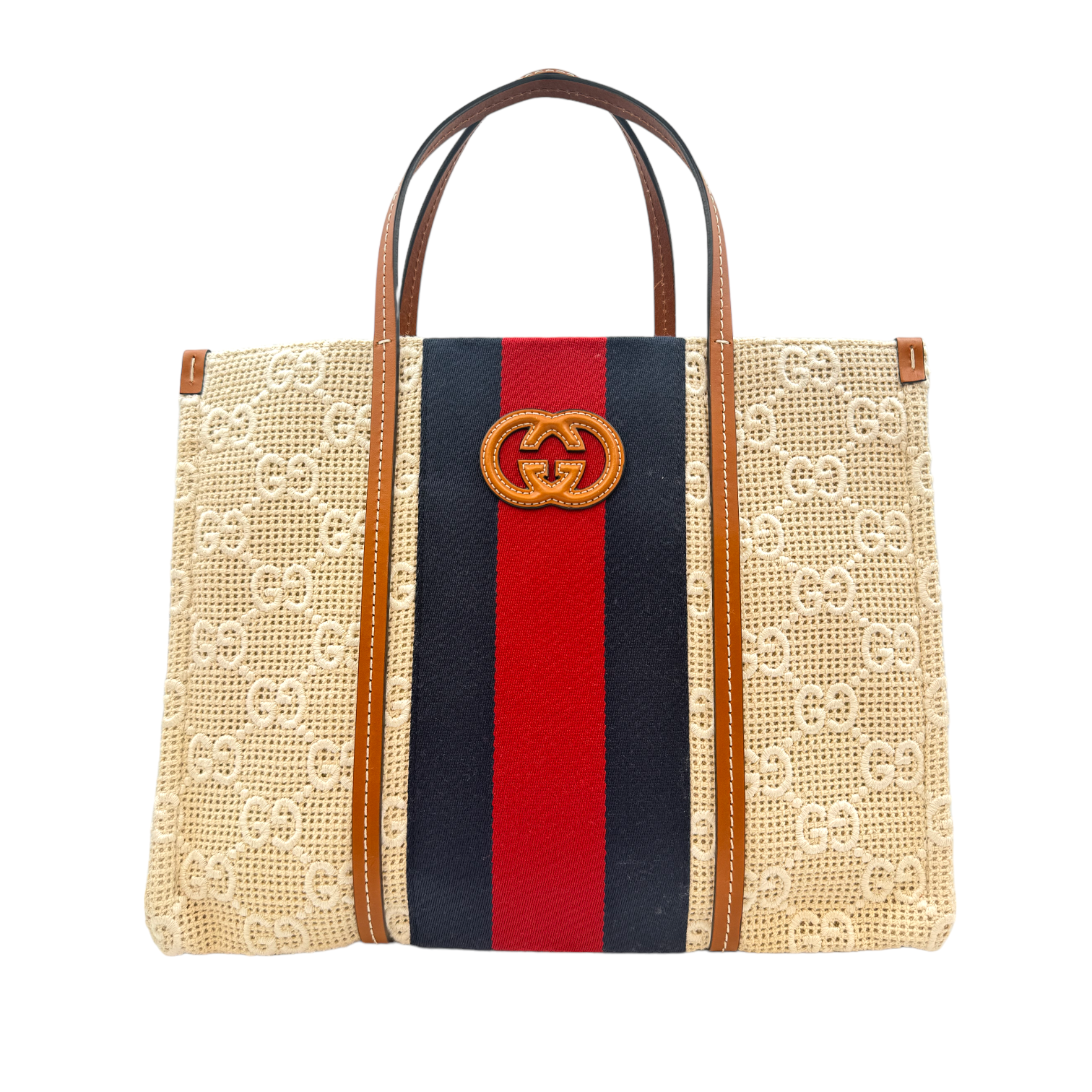 This Gucci Tote BAG was made of light brown canvas and has brown leather caps, which shows Gucci's Guccissima pattern in the form of a embossing. The image of silver details and flat, leather shoulder straps is completed. You can get access to the interior of the Bag. Here has the Bag Via a zipper compartment and plug -in compartments on the opposite side. the Bag is preferably led to the shoulder.