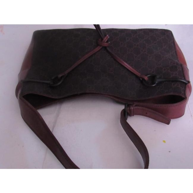 The bag is a tote or satchel style purse by GUCCI. It is made from brown heavy canvas fabric with a large G logo print and brown leather. It has equestrian accents and a leather drawstring top that is more for style than practical use. It has a snap top closure with a wide, adjustable leather strap. The interior is made in a very clean brown fabric with a large zip pocket.