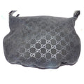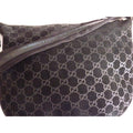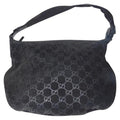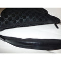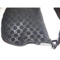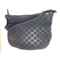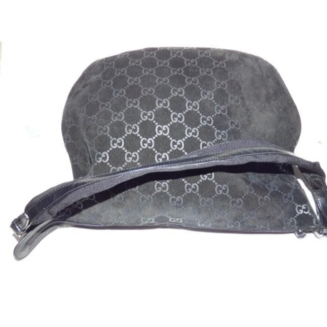The bag is a large, hobo style shoulder purse. The body is made of a black suede with a semi-metallic large G logo print and leather accents with bold chrome hardware, including great belt accents at the sides where the strap is attached! The rounded bottom purse can hold a lot more than you might think!