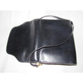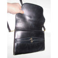 The bag is a larger, envelope top, shoulder purse. The body is made of rich glossy black leather with bold gold hardware, including a great horse bit equestrian accent at the center where it closes and sides where the strap is attached! The rectangular shaped purse has an expandable, accordion style bottom, so it can hold a lot more than you might think! To close it, you slide the lip of the envelope top into the band with the equestrian accents.