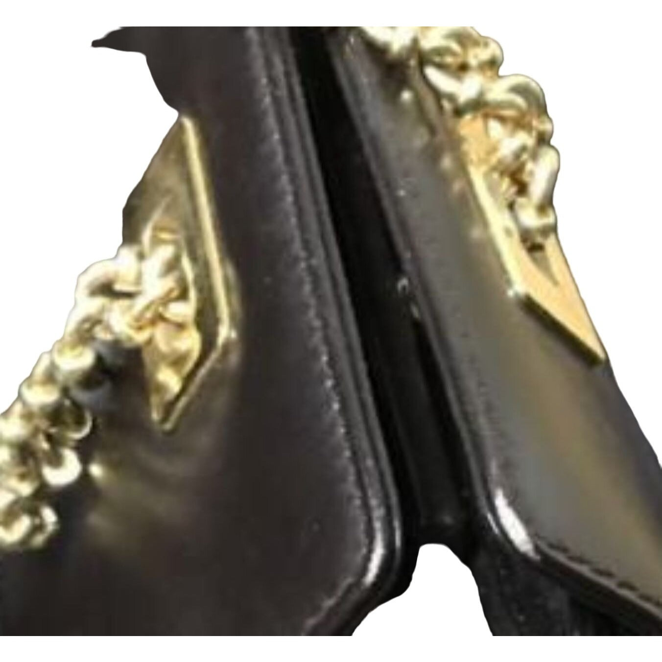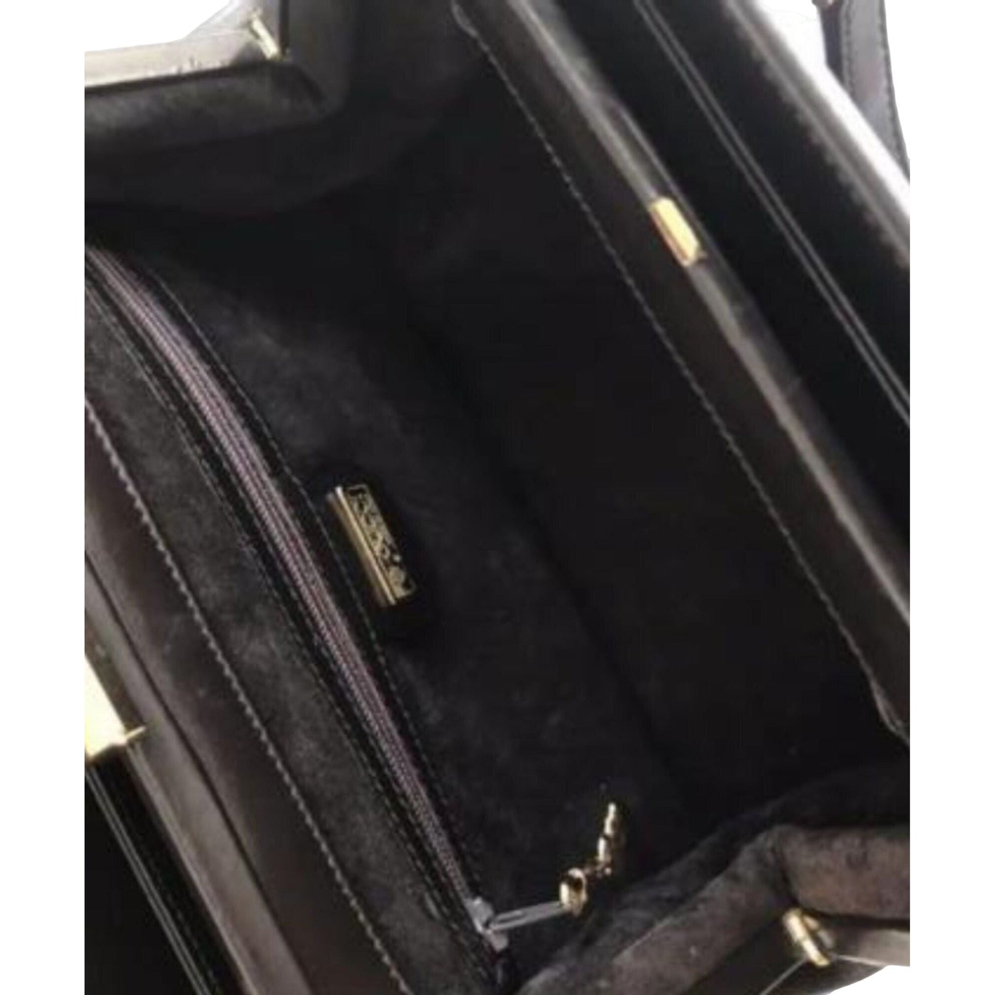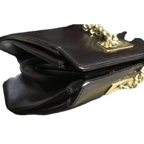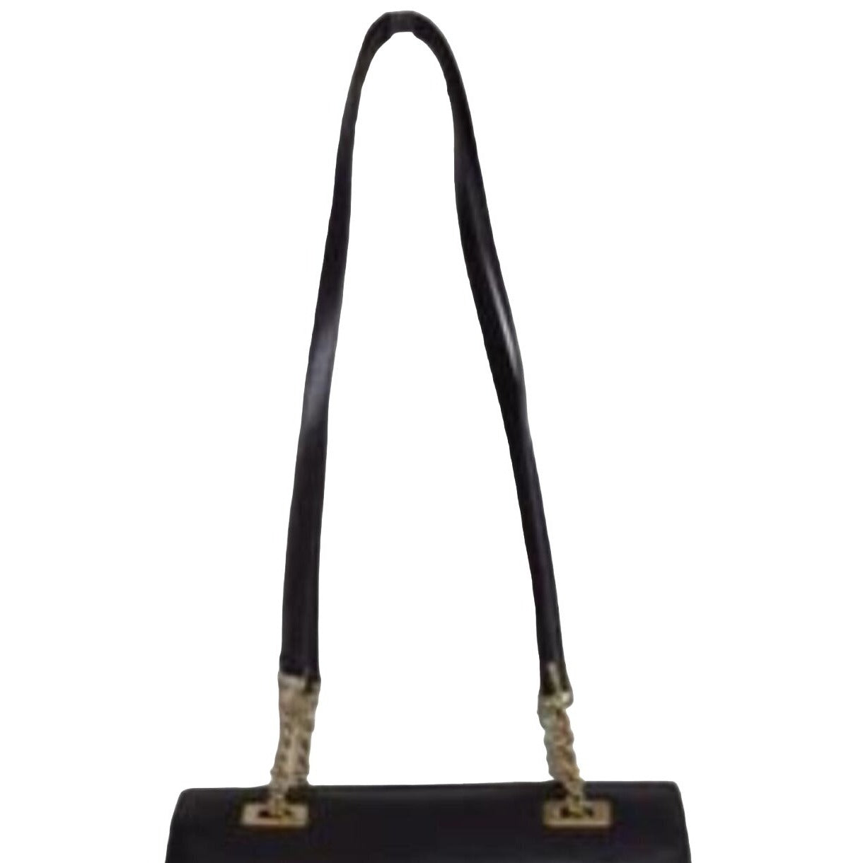 The bag is a large satchel with snap hinged top, two longer gold chain & leather shoulder straps . This purse is designed in such a smart style! The purse has lots of compartments & pocket. The purse is made of glossy brown leather with minimal scratches.