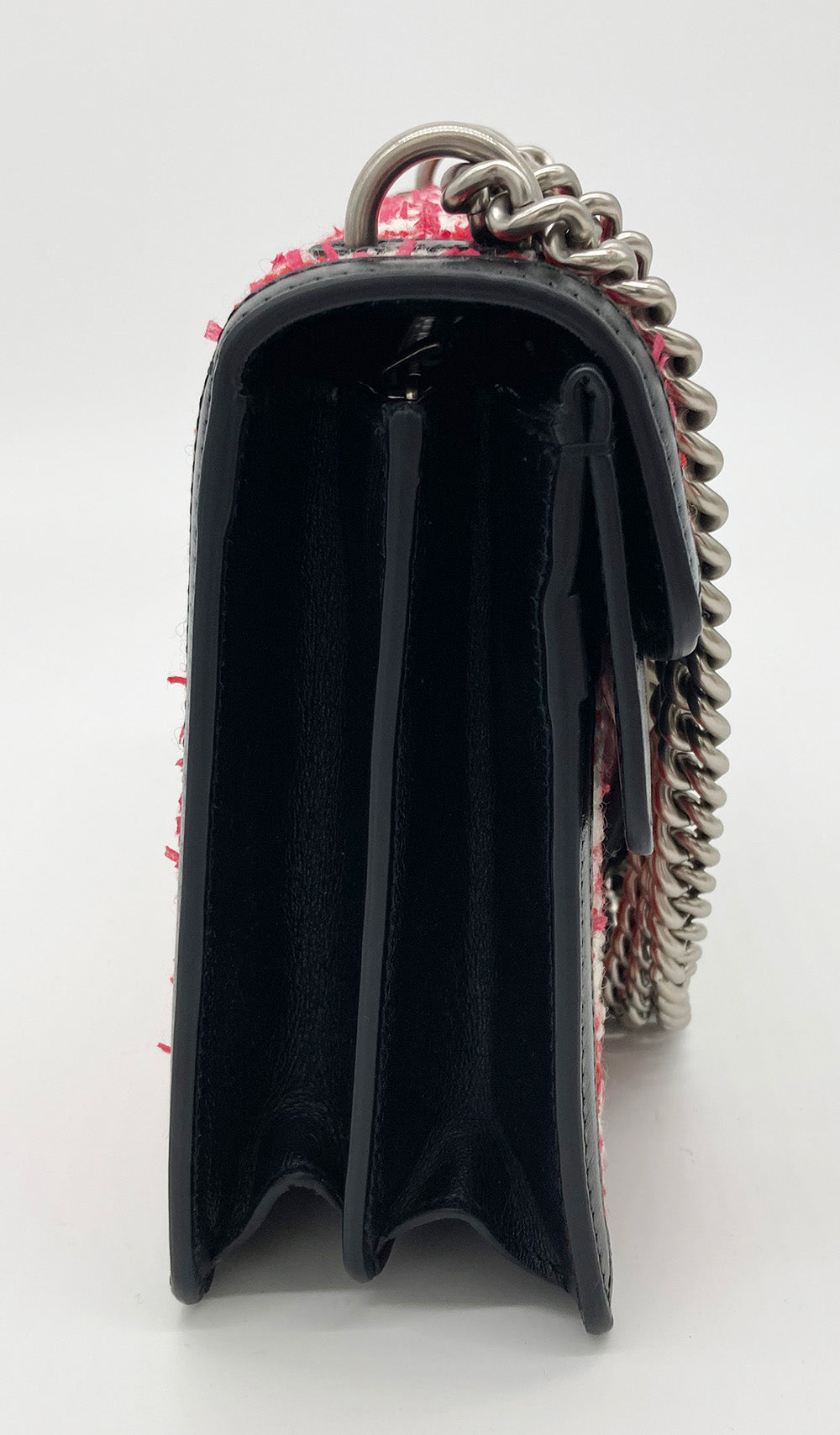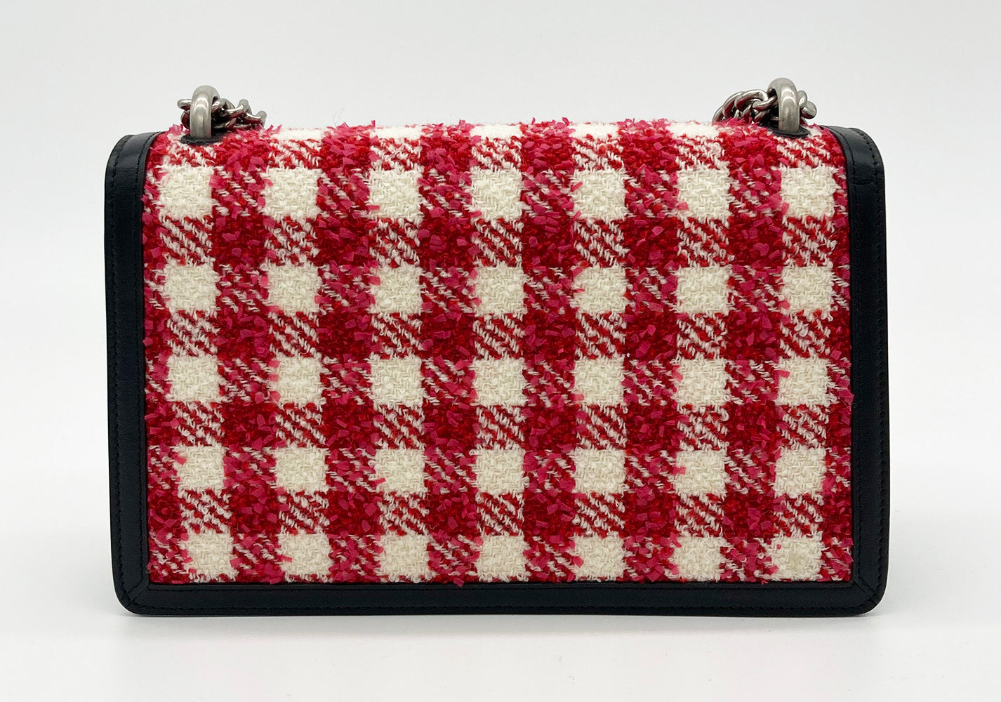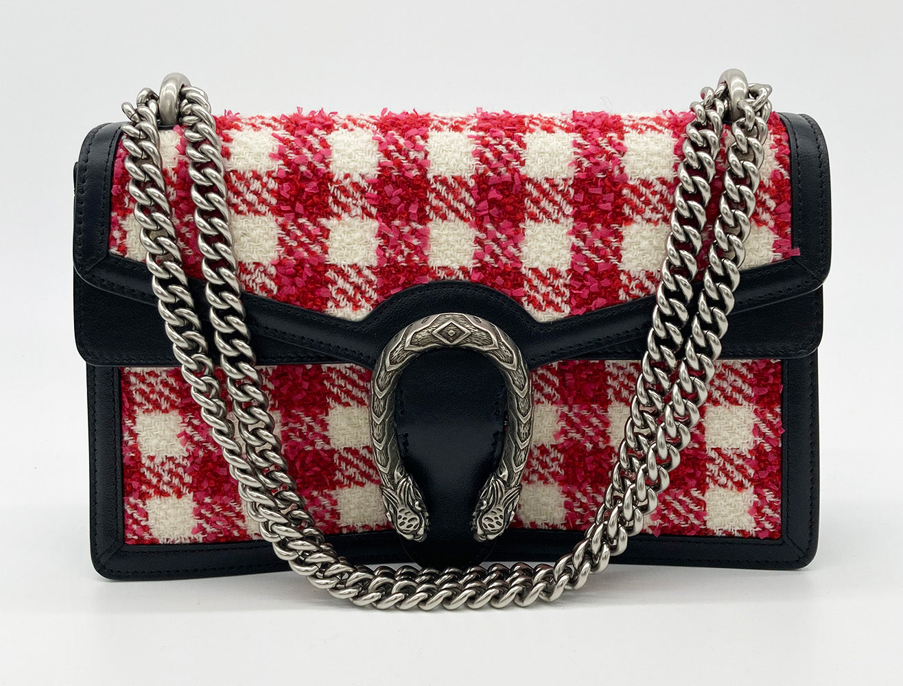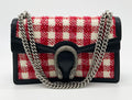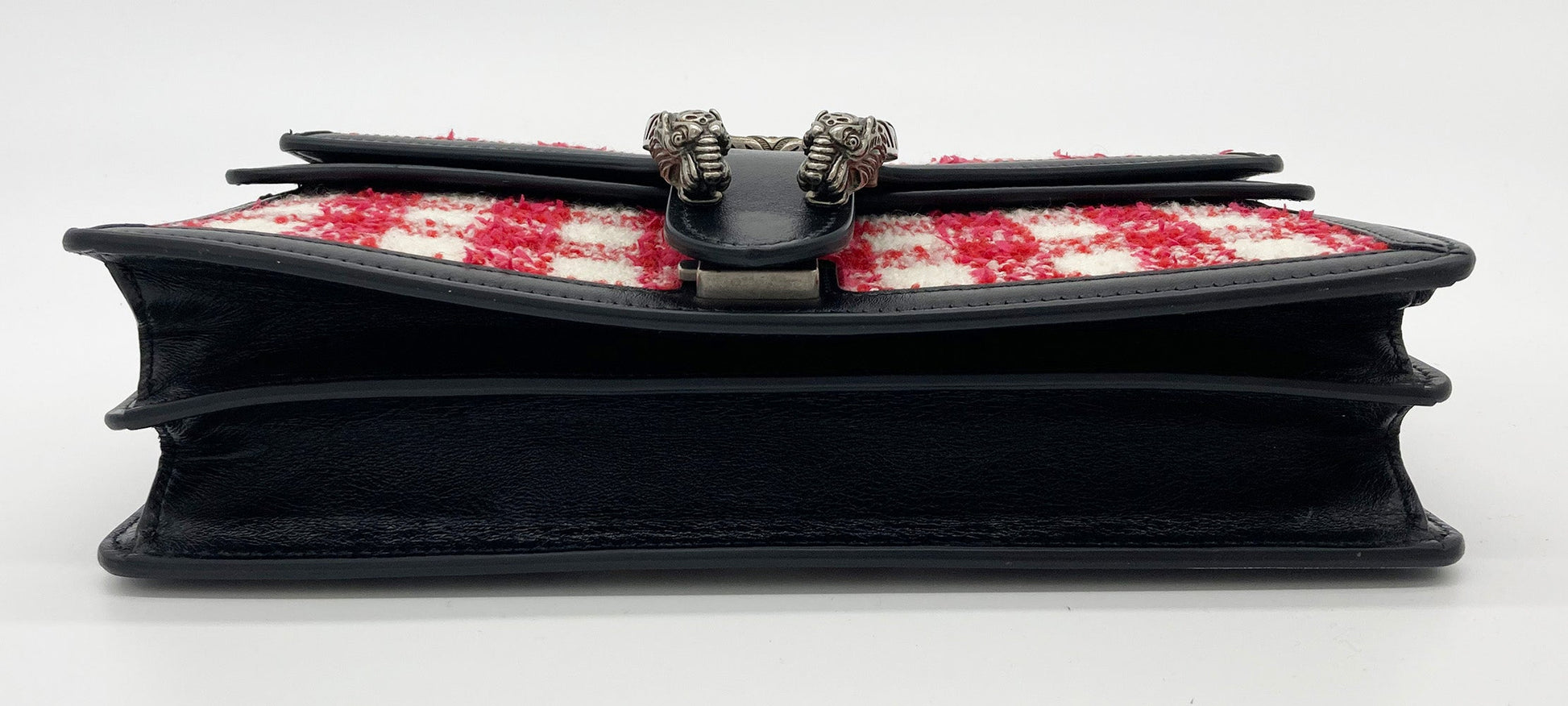 Gucci Vichy Wool Tweed Small Dionysus Shoulder Bag in New unused condition. red and white plaid wool exterior trimmed with black leather and ruthenium hardware. Signature dionysus style front snap double flap opens to a nude suede interior with 2 compartments. Centered zip pocket for added storage. No stains smells or scuffs. clean corners edges and interior. This piece is in new unused condition. purchase includes a dust cover. measurements: 11x6x2.75" 8.5-14.5" strap
