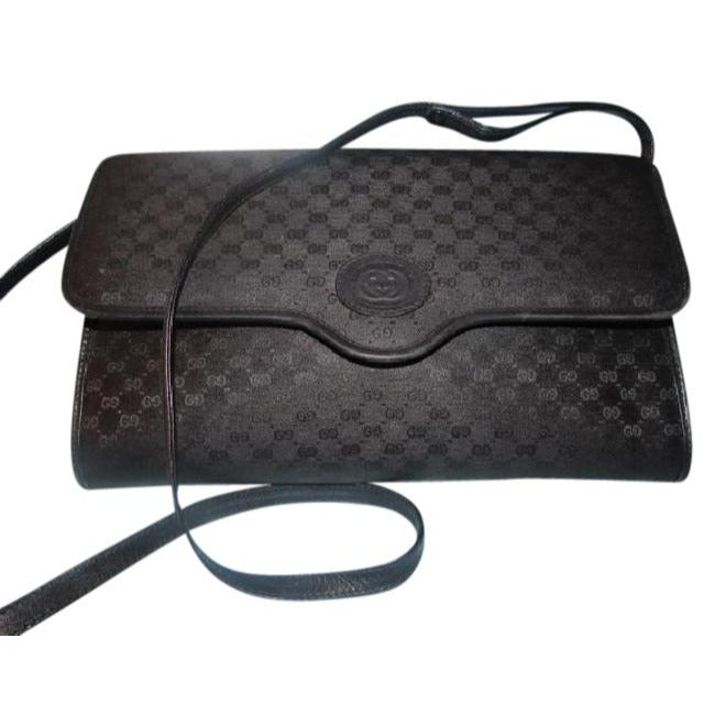 * For sale is a vintage, Gucci, micro Guccissima print and black leather, two-way- convertible, shoulder bag or clutch style purse with gold tone hardware, an envelope top, a large oval shaped GG logo patch on the front, a removable/adjustable shoulder strap, and a timeless style! This two-way style purse by Gucci will be the only black bag you will need!