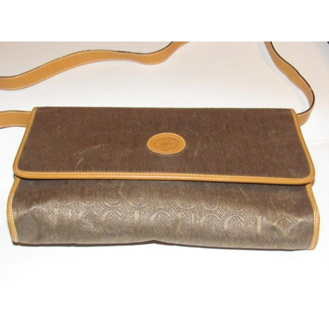 * For sale is a Gucci, brown 'GUCCI' print canvas and camel leather, envelope top, two-way-shoulder bag or clutch with gold tone accents and a removable strap! This two-way, mod purse from Gucci will be the only brown purse you will need!