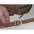 The bag is made of a medium brown, supple leather with gold hardware. The front has an exterior pocket with gold buckle accents that allow it to have two sizes. There are two zip compartments on top, too, giving you lots of pockets to keep you organized!