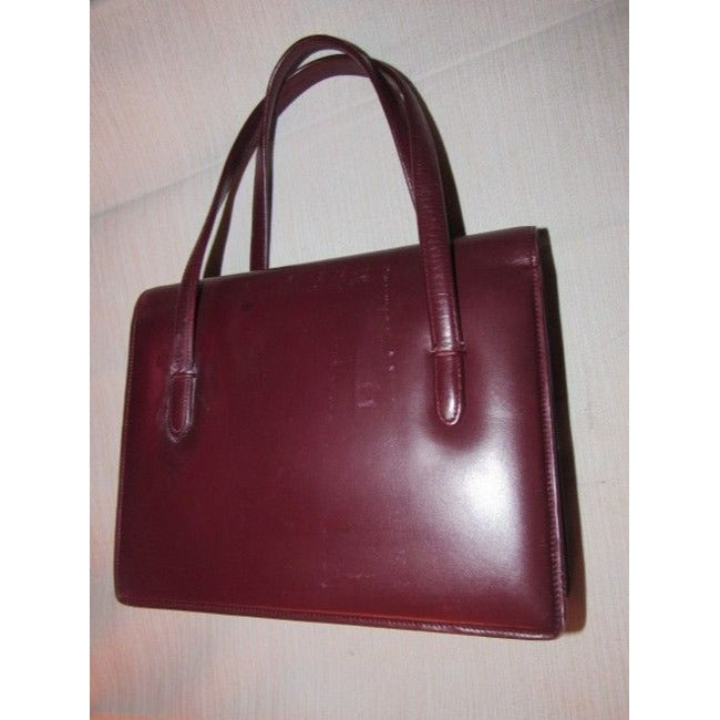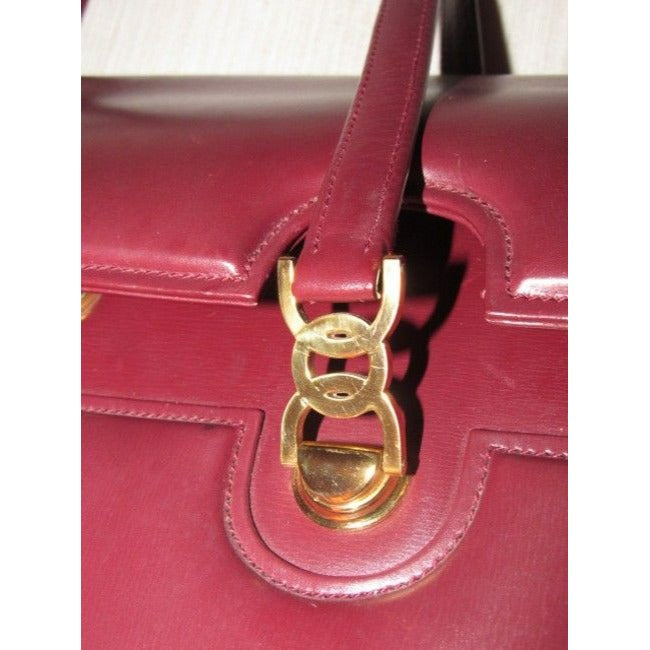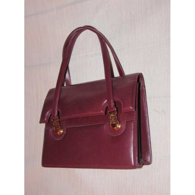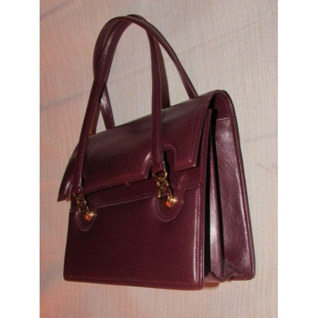 This is a fabulous, vintage, GUCCI, burgundy leather, unique top handle bag in a very mod, Kelly style with two handheld straps! The purse is constructed of burgundy leather in a hard boxy shape with an envelope style top flap at the front of the purse and there are two bold gold logo pieces of hardware that are gorgeous and attach the front handle- see pictures.