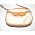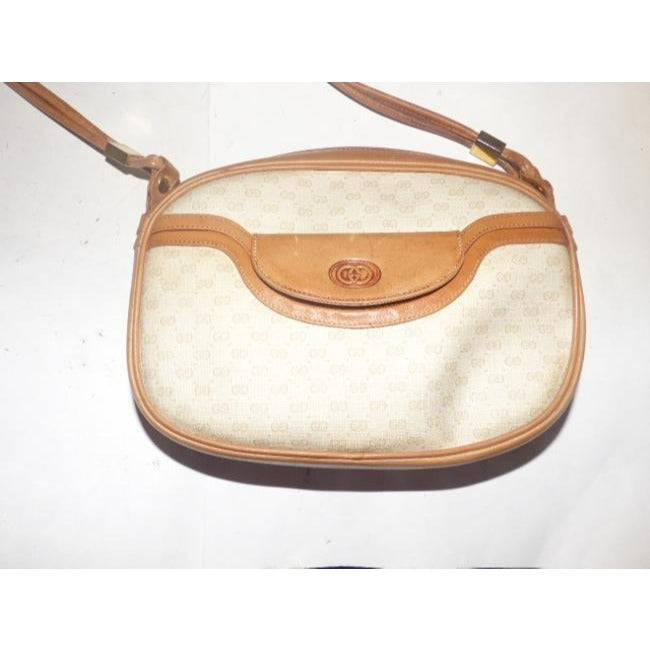 For sale is a vintage, GUCCI, classic, 1980's, ivory coated canvas with camel small logo design and camel leather, cross body/ shoulder bag! This is a unique take on the classic styles that you will love!