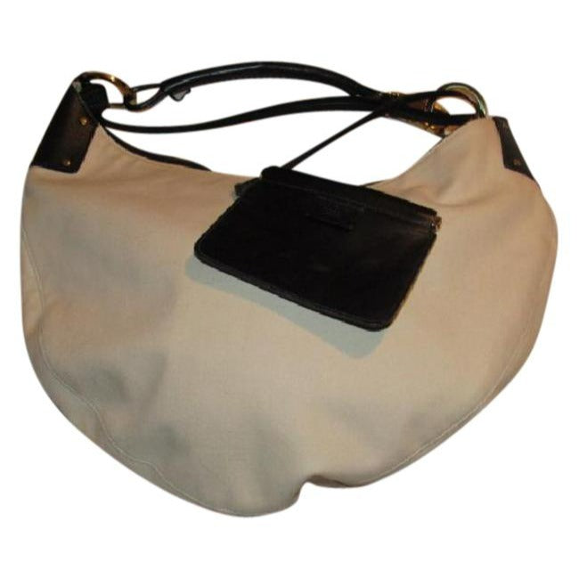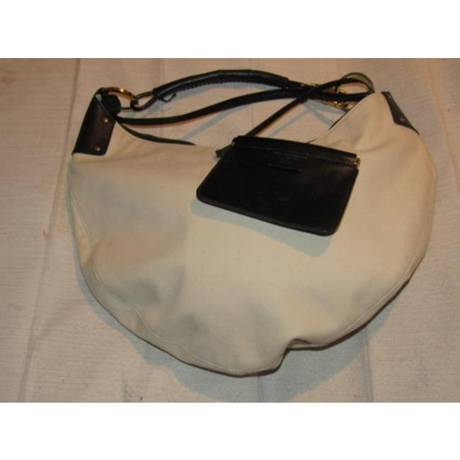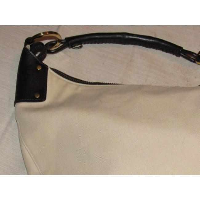 For sale is a Gucci, solid white canvas & black leather, extra large, hobo style purse with a heavy, black leather braided strap with bold gold accents, a removable strap, long leather zip pull, and attached black leather wallet! It is a classic style that would be great used as a purse for everyday or as your go to light neutral bag!