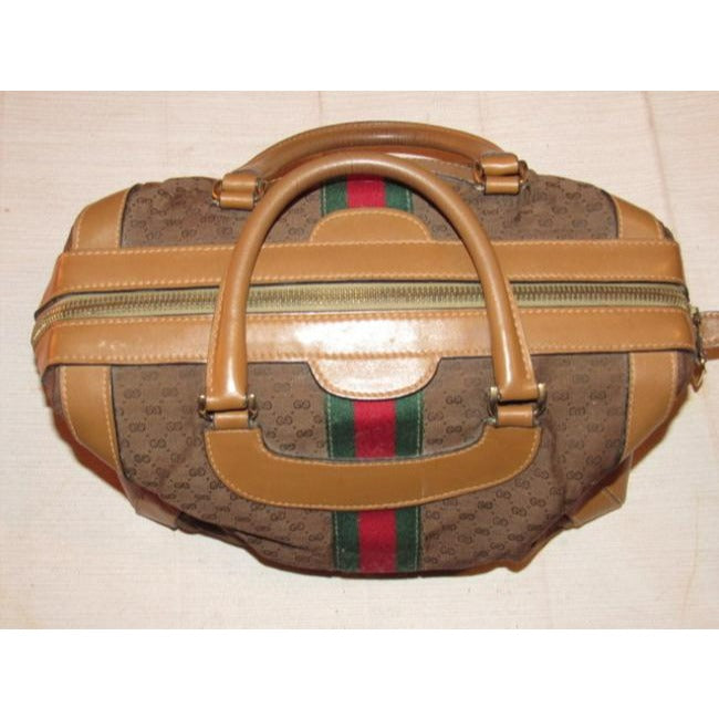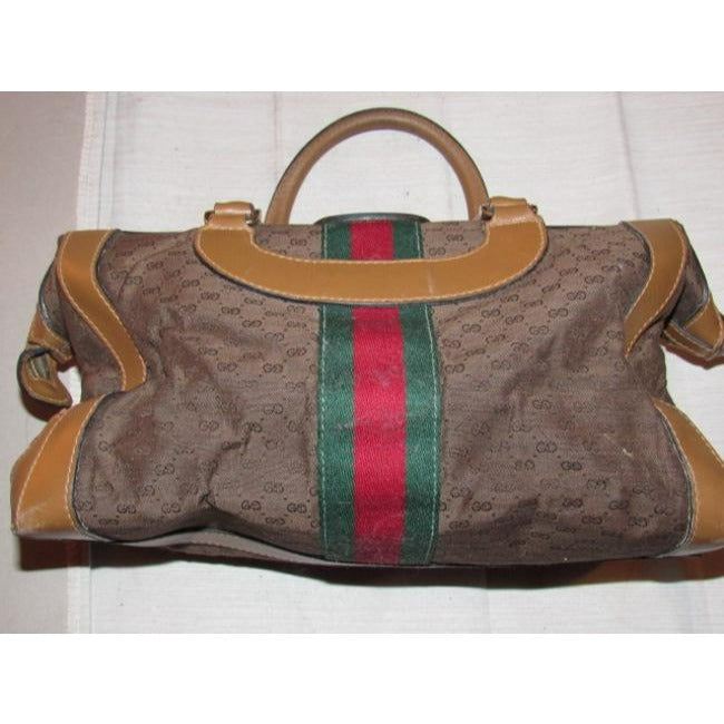 This is a fabulous, extra large size, top zip, 1960's mod, early GUCCI two handle satchel style purse! It is made of brown small G logo print canvas fabric & camel/chestnut brown colored leather throughout the purse- on the piping, trim, opening around the zip top closure, and two handles. The red and green stripes go around the center of the bag, like an early version of the Speedy or Boston bag!