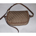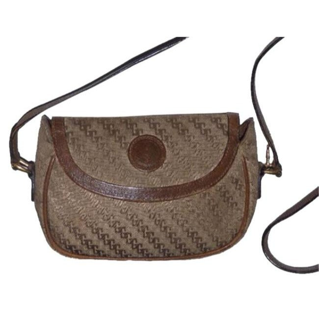 This purse is a rare design you don't often see, especially in this condition! The bag has a squared G logo style print embossed in the fabric in a khaki color. It has brown leather framing the purse at the strap, piping and top. It has an adjustable shoulder strap and is a classic, oval shape with an envelope flap top.