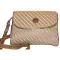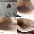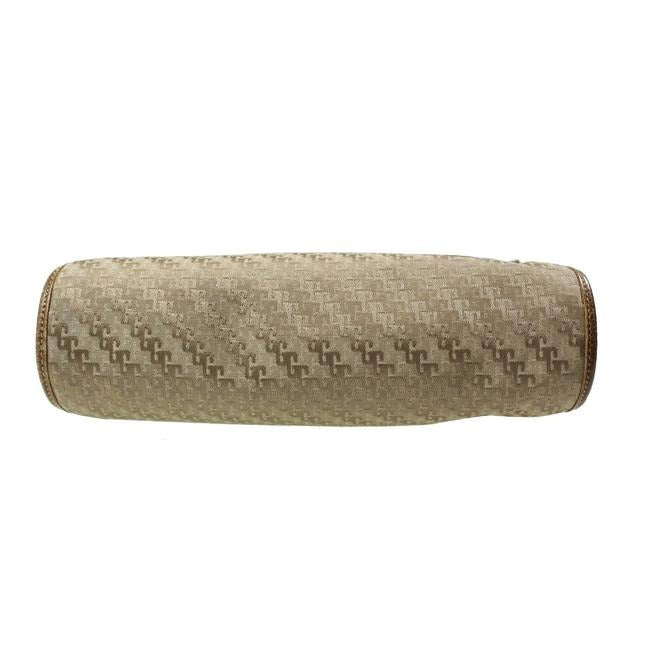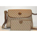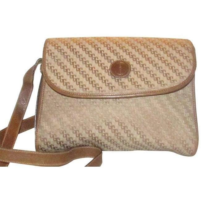 This purse is a rare design you don't often see, especially in this condition! The bag has a squared G logo style print embossed in the fabric in a khaki color. It has brown leather framing the purse at the strap, sides, piping and top. It has an adjustable shoulder strap and is a classic, square shape with an envelope flap top.