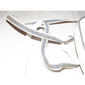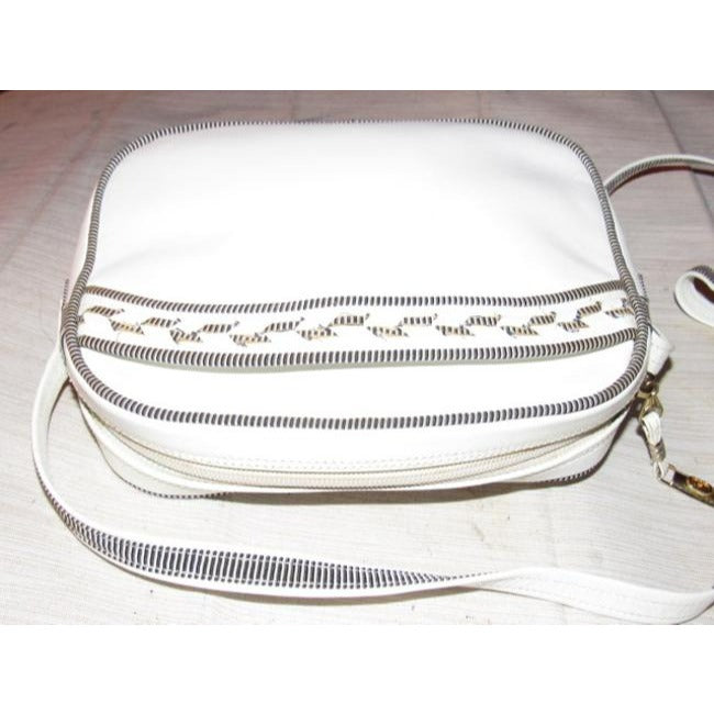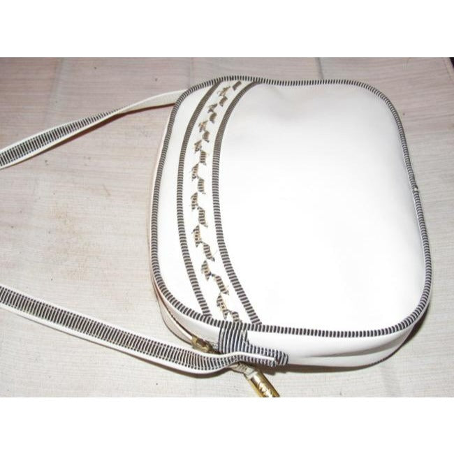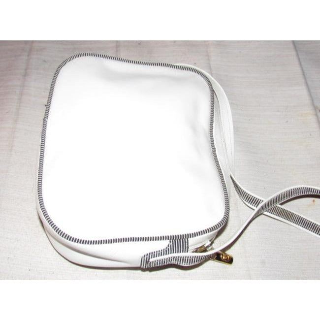 * For sale is a vintage, Gucci, white leather, oval, sling style, cross body/shoulder bag with a top zip closure, black and white dimensional piping, a front pocket, and gold accents! A quality classic from Gucci that will be the only white purse you will need!